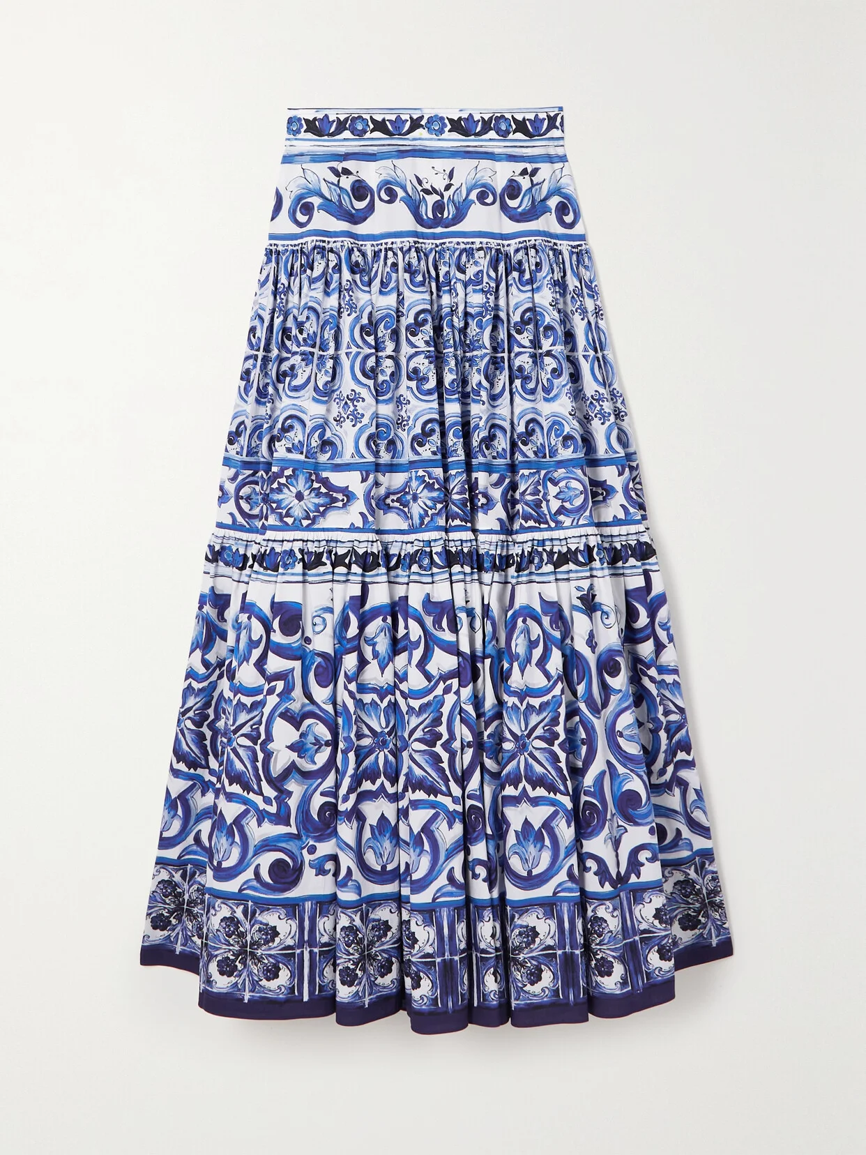 Hand-painted Sicilian ceramics inspire the print on Dolce & Gabbana's skirt. It's made from crisp cotton-poplin, which is pleated through the tiers for swishy movement as you walk.