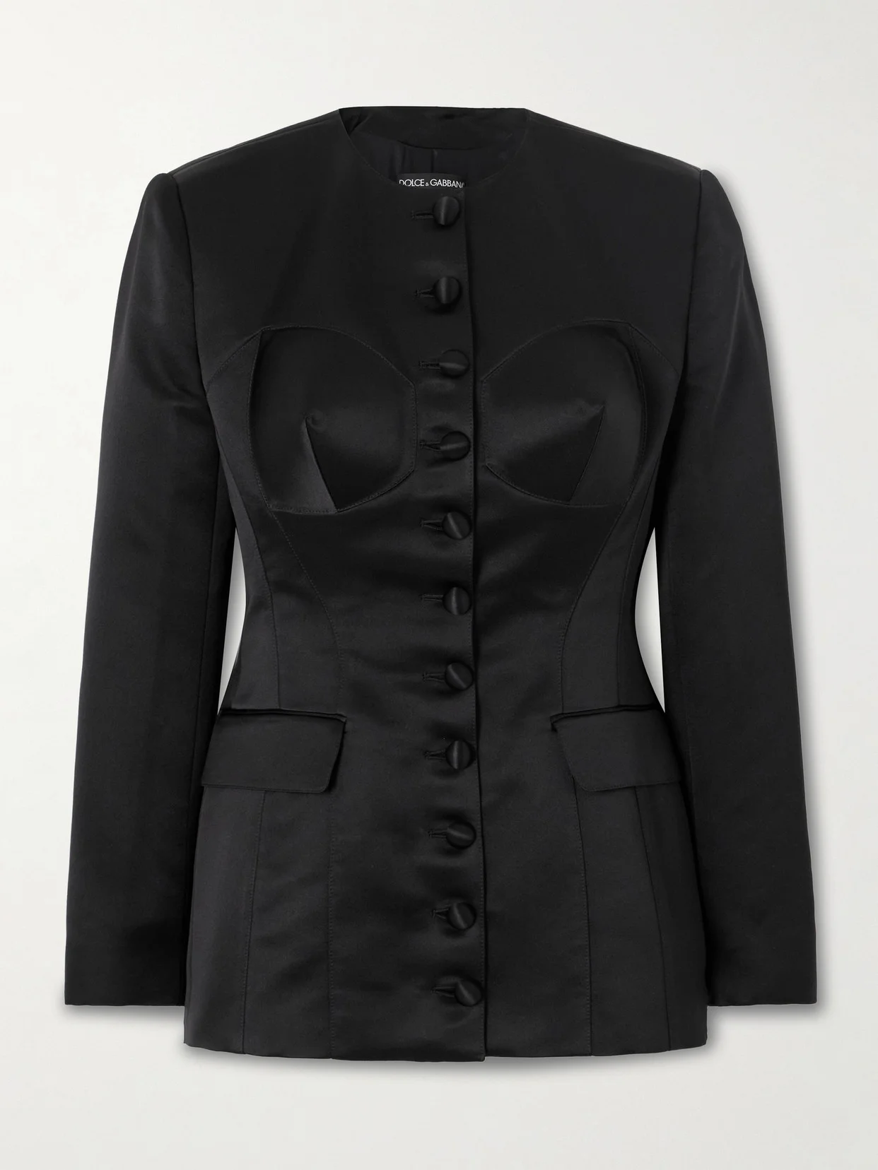 Dolce & Gabbana's Spring '25 collection takes inspiration from glamorous blondes and their wardrobes - most notably the famous cone-shaped cups of Marilyn Monroe and Madonna. This blazer is made from lustrous silk-satin and has a collarless neckline and covered buttons.