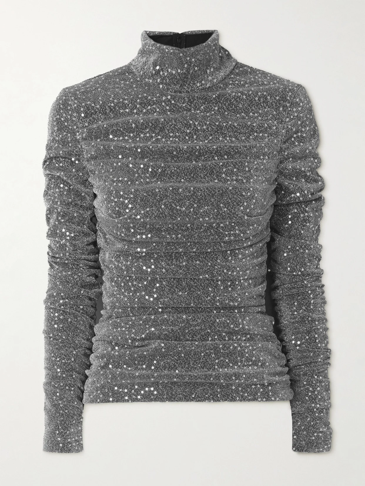 Ruched Sequin-embellished Lurex Turtleneck Blouse