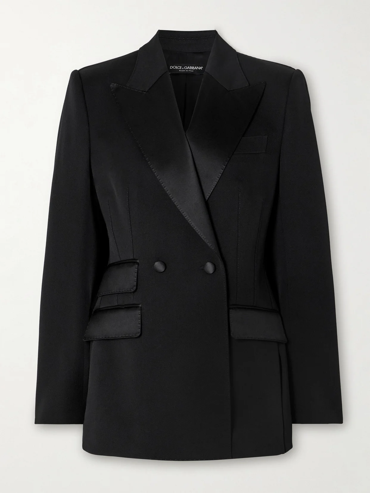 Dolce & Gabbana's wool-blend twill blazer is part of the label's Spring '24 collection inspired by old Sicily. The double-breasted front cinches at the waist to create a subtle hourglass shape and the blazer is traced with silk-satin along the peak lapels, pockets and buttons. Wear yours with the coordinating shorts and opaque tights.
