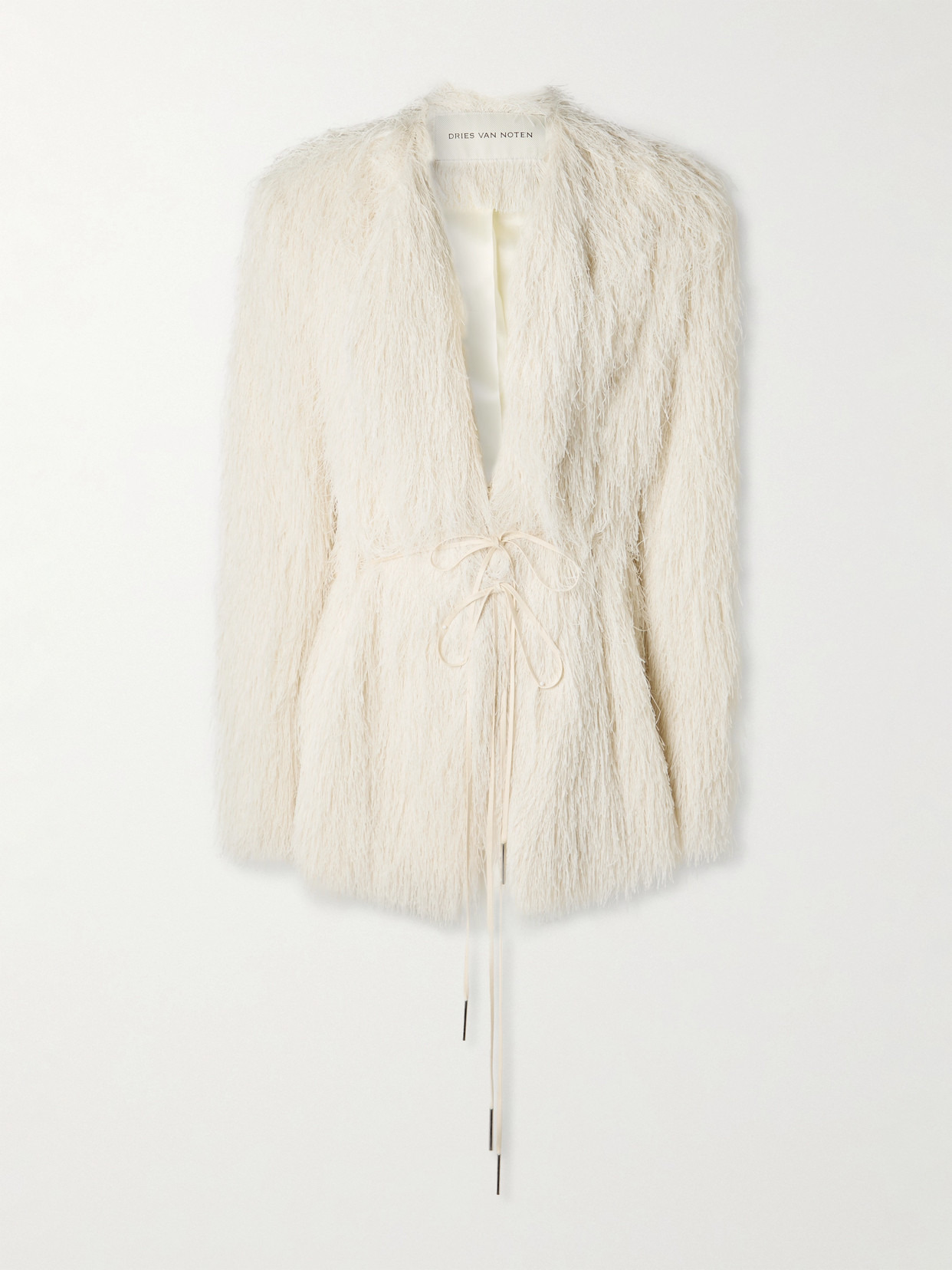 Dries Van Noten's Fall '25 collection celebrates "elegance from other eras in the key of today." Reminiscent of 1920s flapper style, this jacket has a wrap shape and is covered with frothy fringing. It was worn on the runway with the matching dress for a double dose of texture.