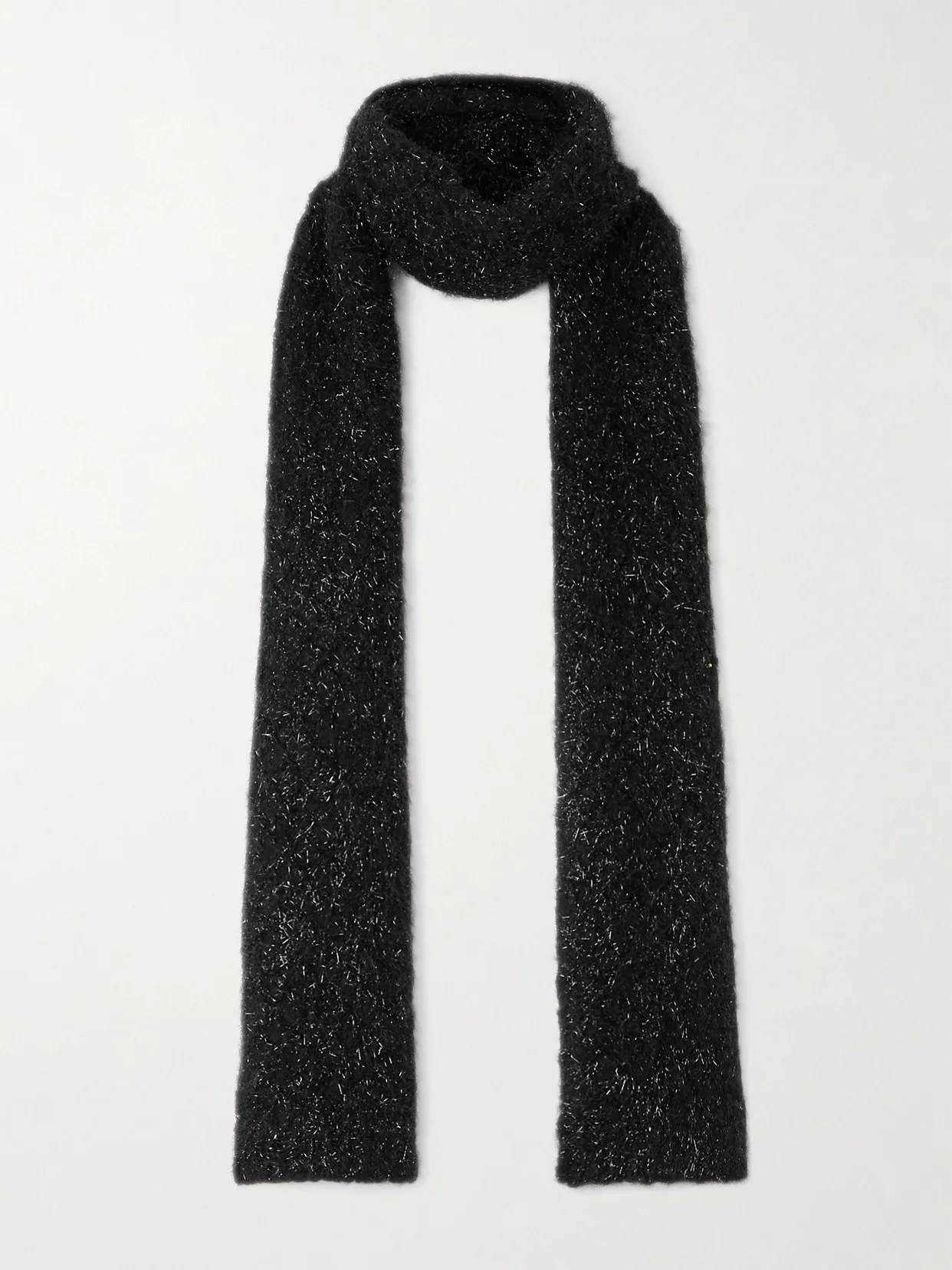 Dries Van Noten's scarf is made from black wool-blend that's flecked with shimmery metallic threads and brushed for a soft, tactile finish. Layer yours beneath the lapels of a double-breasted coat.