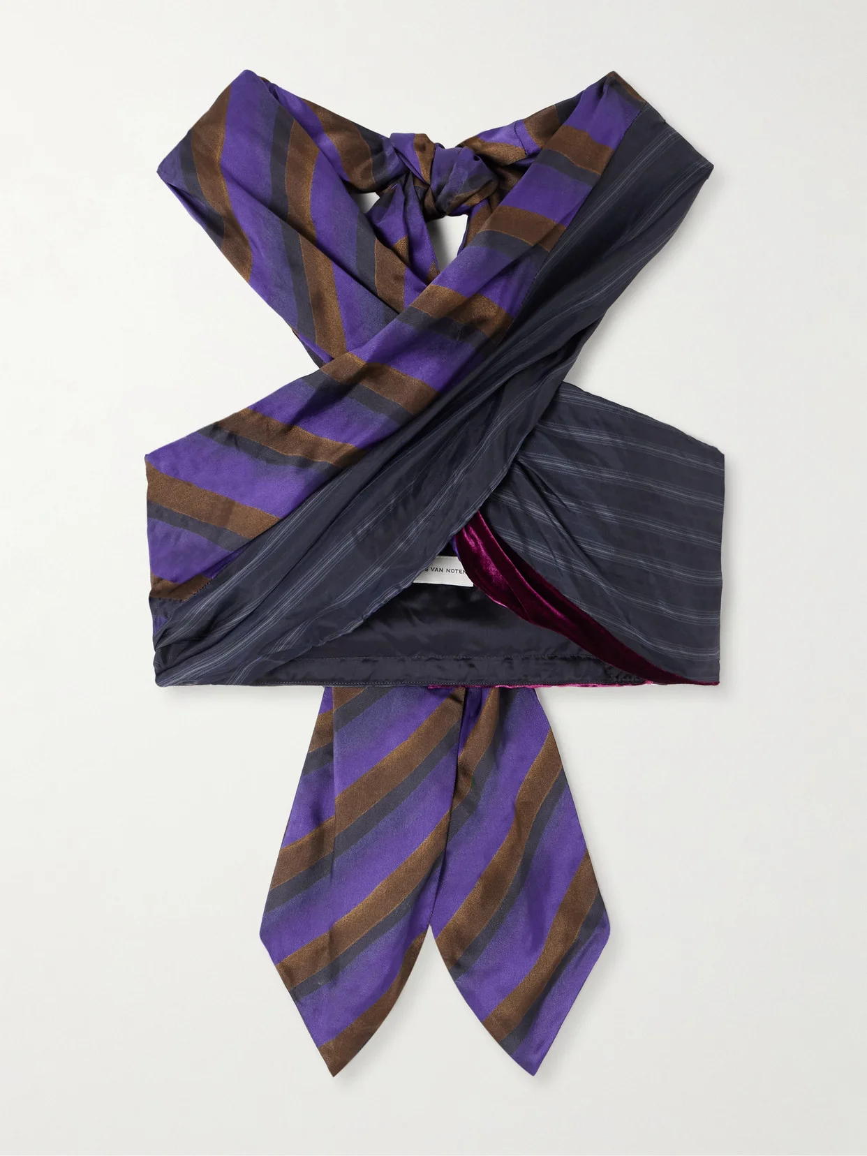 Dries Van Noten's sultry cropped top was styled with an oversized blazer on the runway of Julian Klausner's debut Fall '25 collection. It's cut from printed voile with a crossover front to tie at the neck and trimmed with soft velvet.