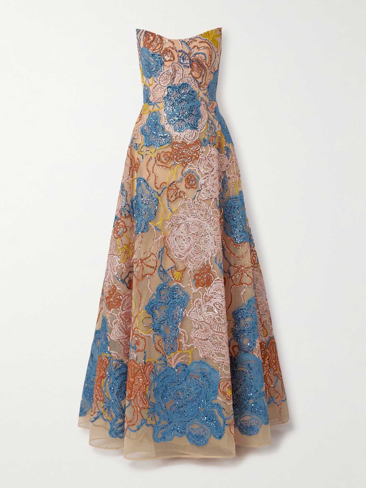 Strapless Belted Sequin-embellished Embroidered Tulle Gown