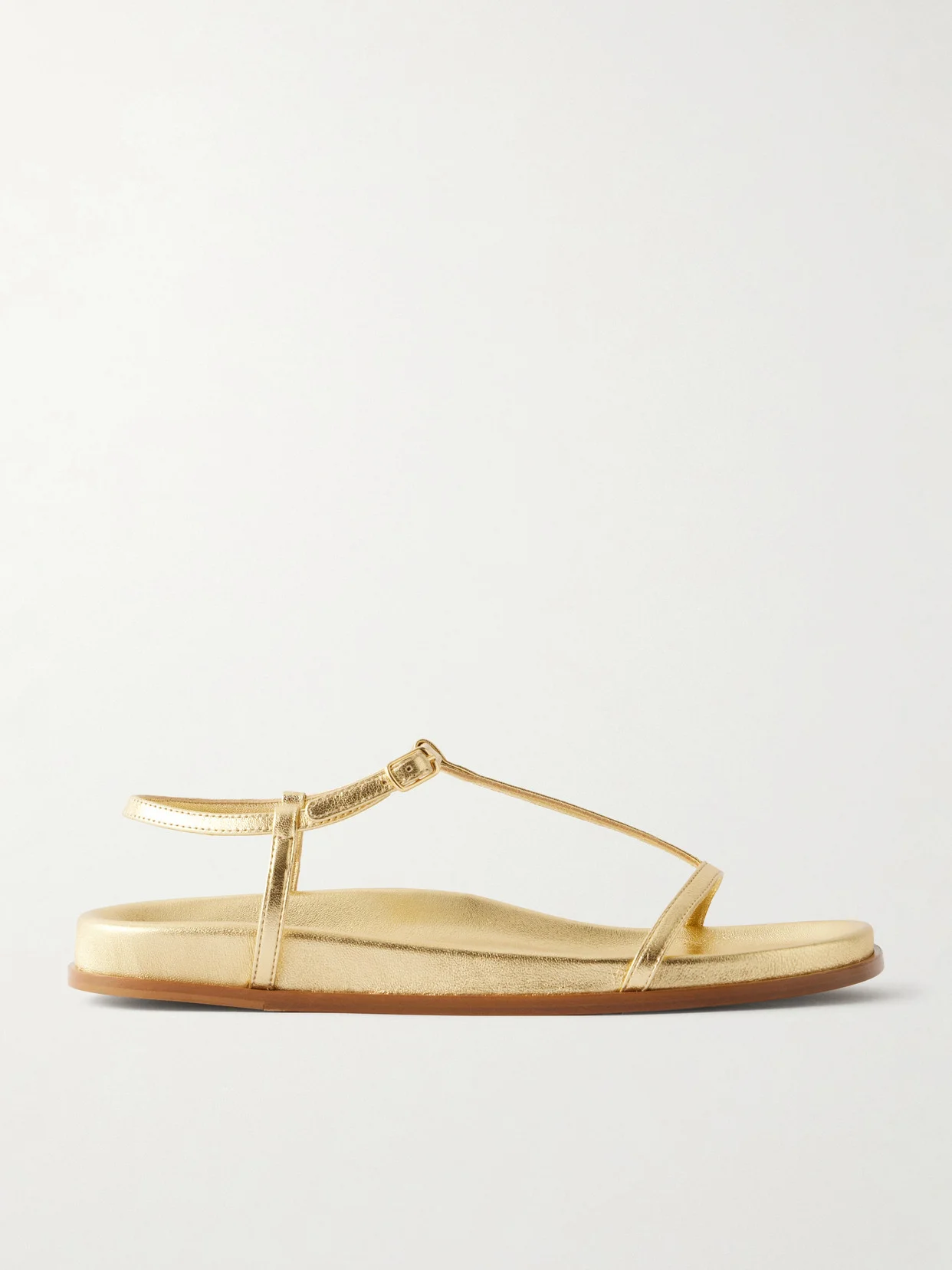 The 'Aya' sandals by Emme Parsons are defined by delicate straps that form a T-shape across the foot and loop around the ankle. Crafted from washed gold nappa leather, they rest on a welted footbed and are finished with a slender buckle to adjust the fit.