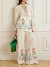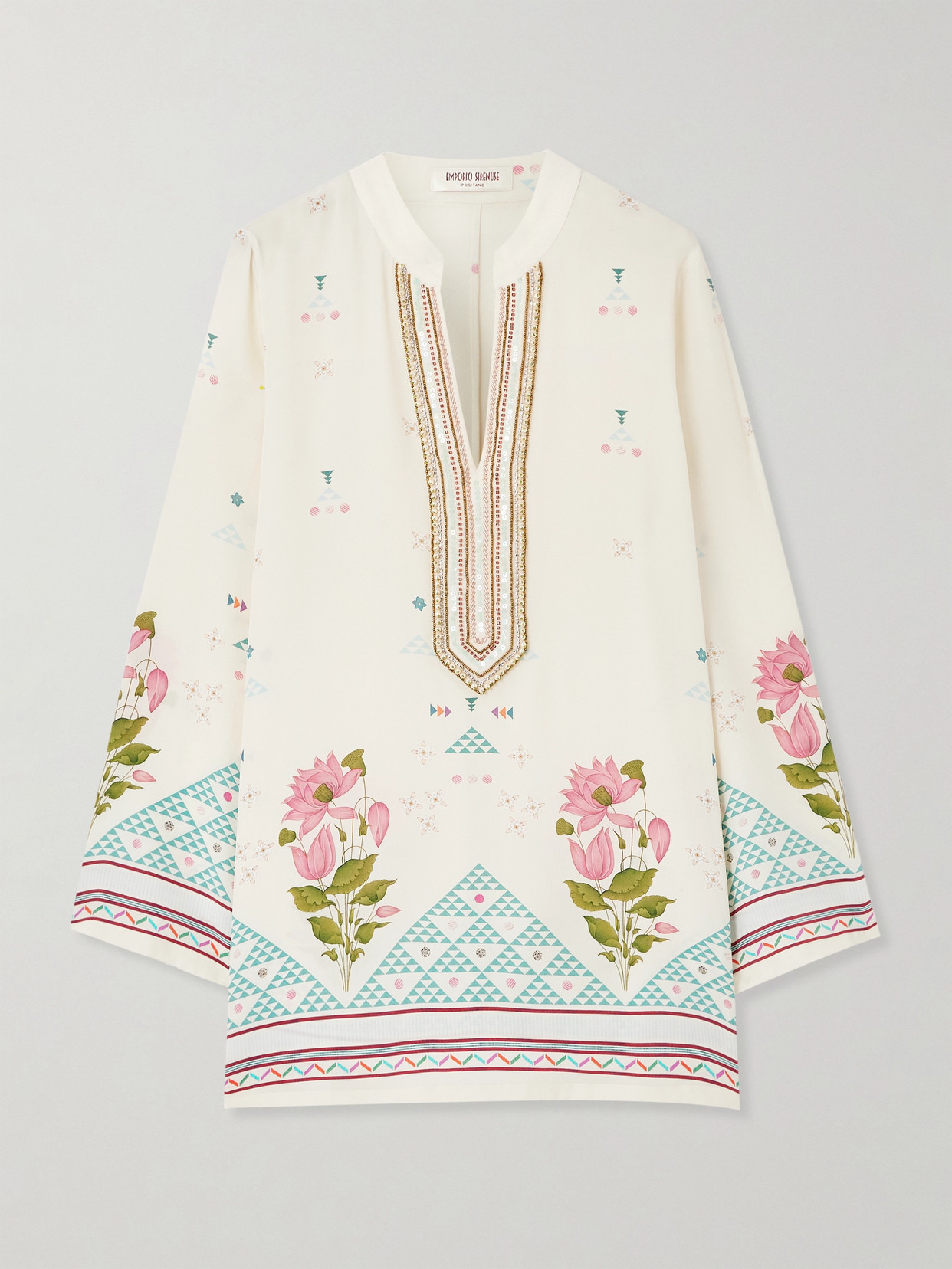 Emporio Sirenuse's ‘Jamila' kaftan blends global influences with the glamour of the Amalfi Coast. Crafted from lightweight silk-crepe, it's printed with blooming roses and hand-embellished with beads along the neckline. Wear yours with the matching pants and sandals. Responsible Craftsmanship. This product promotes artisanal skills and a brand that invests in communities and adheres to fair-trade principles. Find out more about our NET SUSTAIN criteria here.