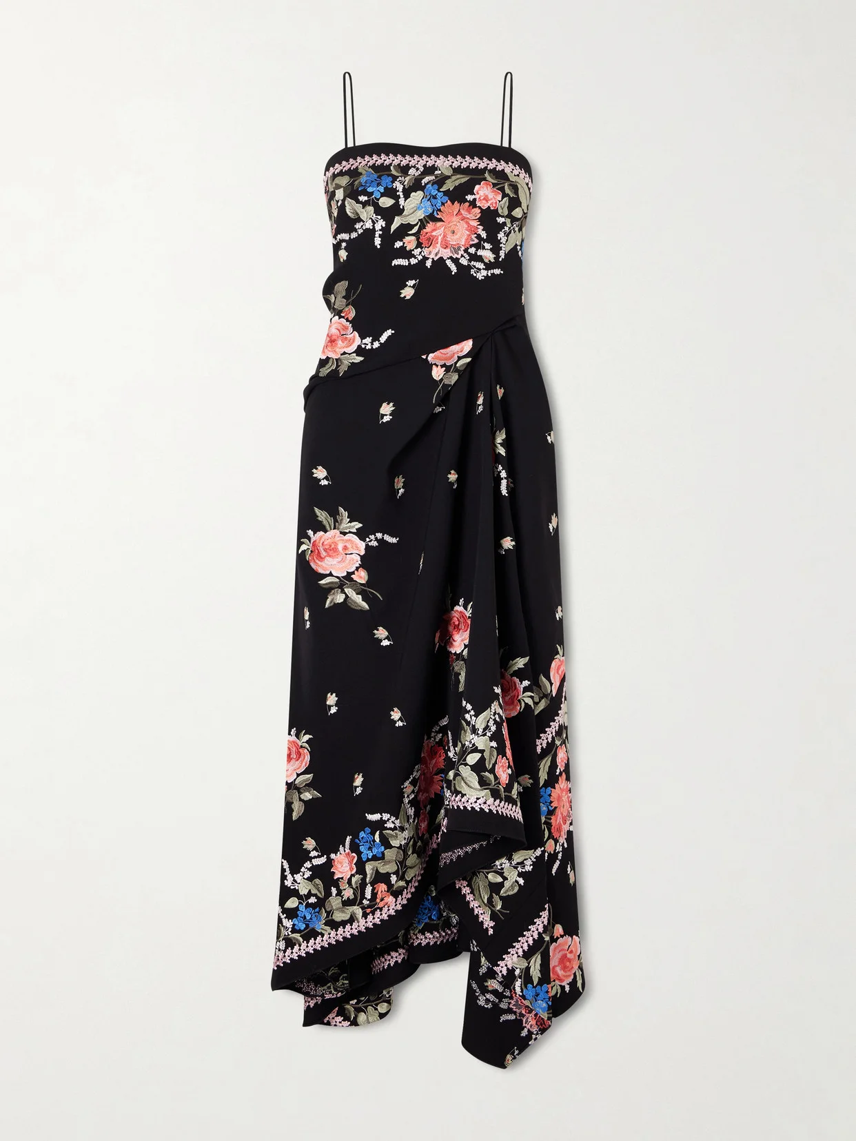 Erdem's dress is spilling with blooms that look as if lifted from the pages of a fairytale. Made from grain de poudre wool, it has an elegant square neckline and is ornately embroidered throughout. The waist descends to a romantic draped handkerchief hem.