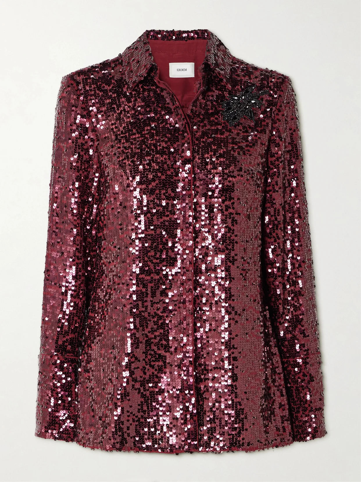 Erdem's Pre-Fall '25 is gorgeously bedazzled, echoed in the shimmer of this shirt. It's tailored from crepe de chine encrusted with 'Mulberry Red' sequins and finished with black crystals at the chest.