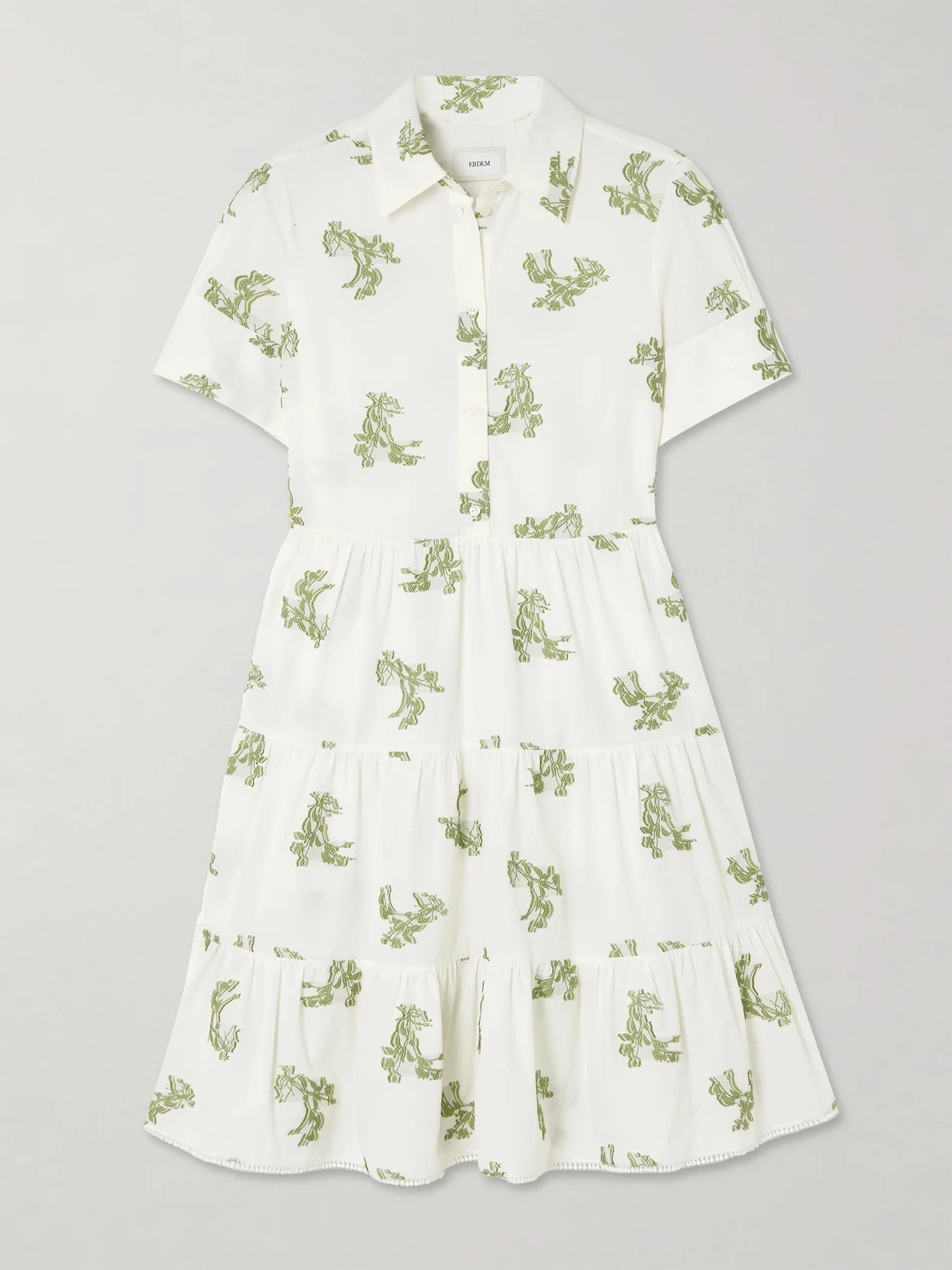 Erdem is best known for its romantic floral patterns. This dress is embroidered with intricate fil coupe flowers that really pop against the white cotton. It has a smart, shirt-inspired top and a tiered mini skirt.