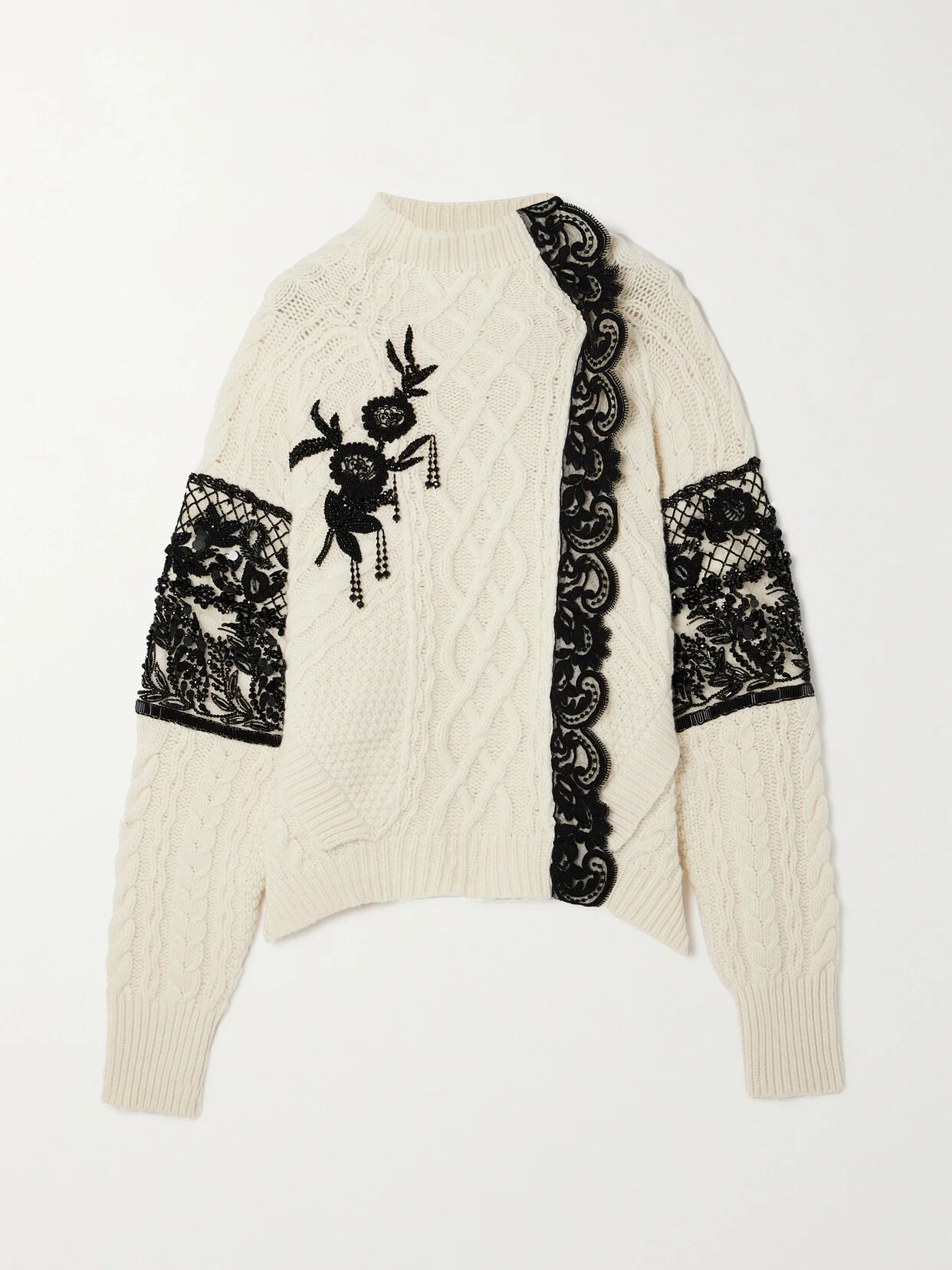 Lace-trimmed Embellished Cable-knit Wool-blend Sweater