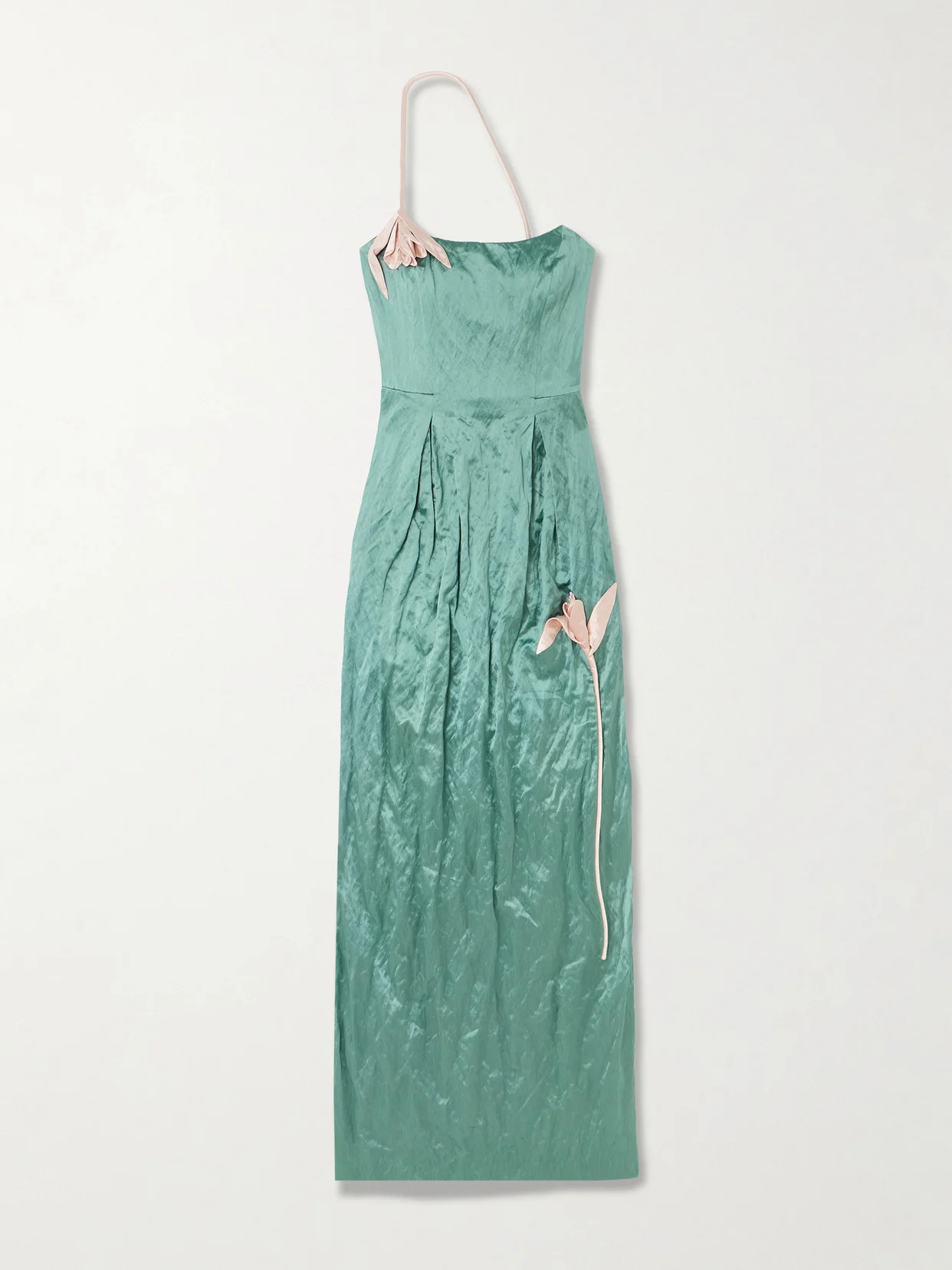 Erdem's gown is appliqued with two sculptural tulips - one along the strap, the other on the skirt. It's made from lustrous crinkled-satin and has a structured bodice that falls to a flowy, floor-length skirt. Look closely and you'll notice pearlescent beads inside each flower.