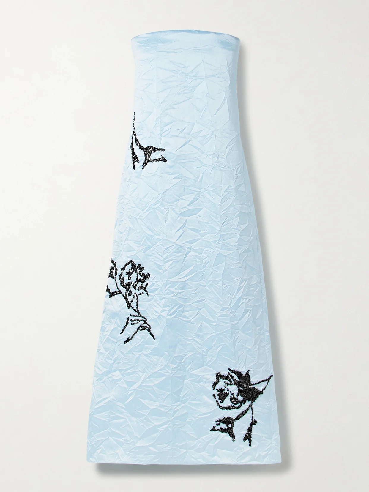 For Fall '25, Erdem blurs the line between fashion and fine art, collaborating with British painter Kaye Donachie to bring her haunting, romantic portraits to life on fabric. Cut from intentionally crinkled-satin, this dress is decorated with beads and sequins arranged to depict her floral sketches. A full lining and internal corset support the strapless design.