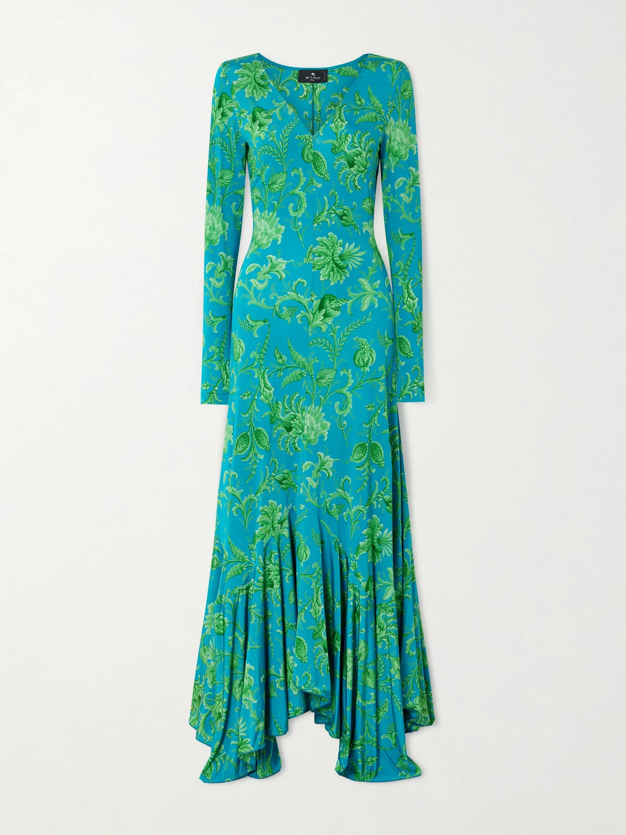 Etro's dress shimmers with the label's signature bohemian energy. Cut from fluid stretch-jersey, it skims the body before falling into a softly draped handkerchief hem that moves beautifully as you walk. The plunging neckline pairs perfectly with layered gold jewelry.