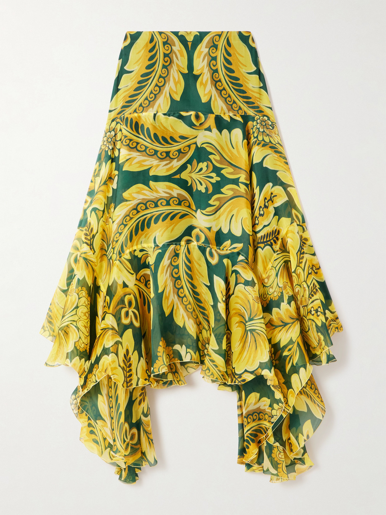 Etro's skirt appeared on the Fall '25 runway with a slew of joyful looks. It's made from silk printed with acanthus leaves and falls in tumbling ruffles to a handkerchief hemline. Pay tribute to the show styling and team yours with boots and the matching blouse.
