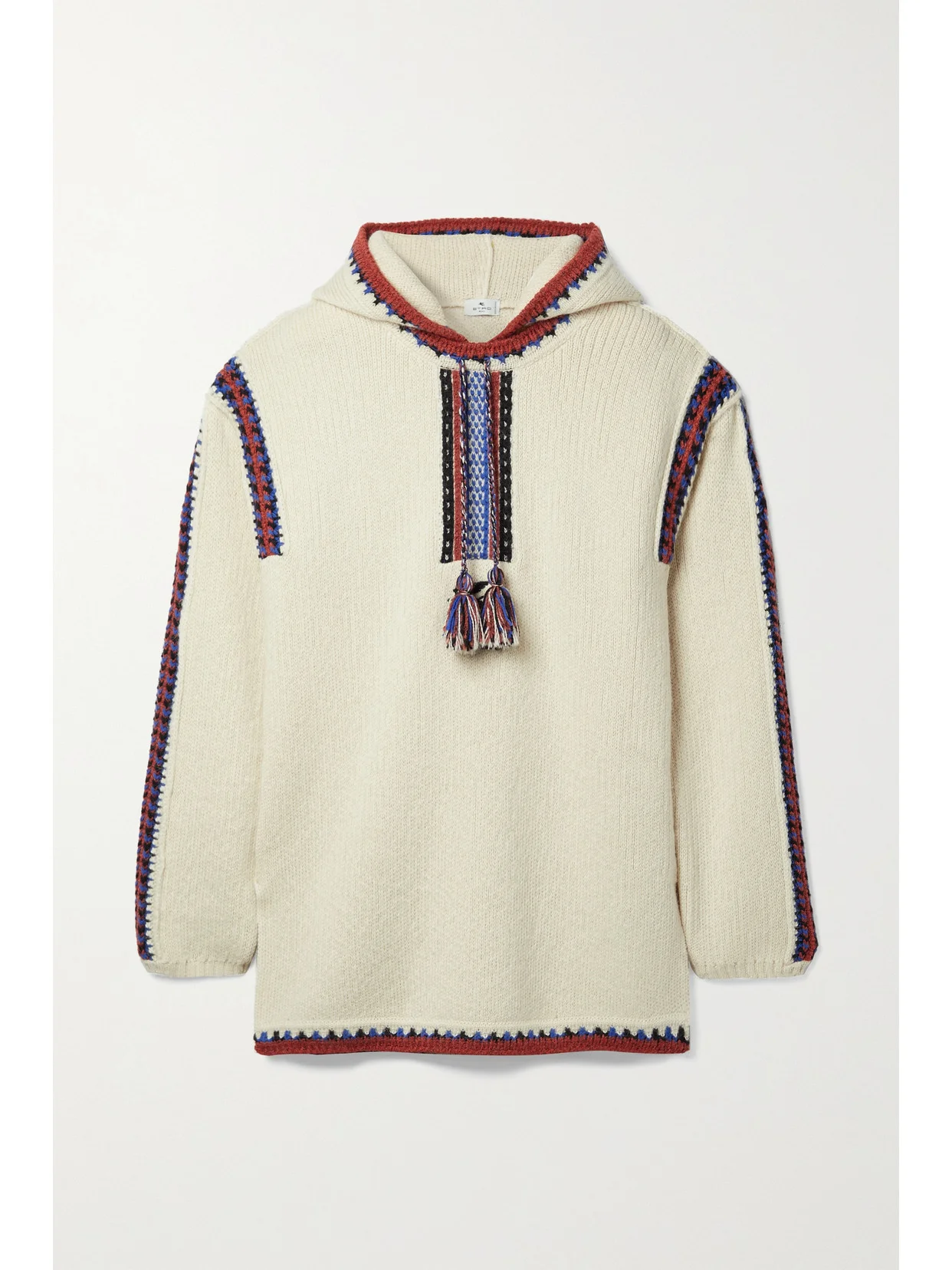 Etro's hooded 'Klara' sweater is knitted from a soft wool-blend that's intricately embroidered with contrasting patterns. Designed for a relaxed fit, it has tasseled ties and splits at the hem. Wear yours partially tucked into denim.