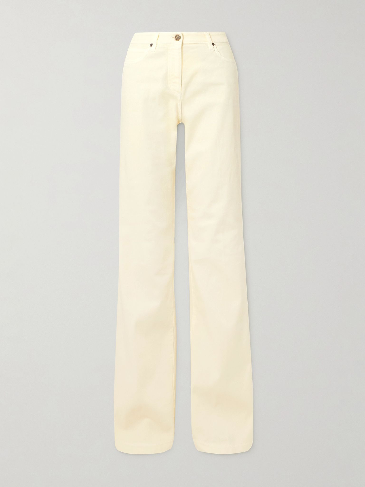 Etro's jeans nod to classic '70s shapes – note the low rise, flared legs and floor-pooling cuffs. They're made from cream denim and have a five-pocket construction and signature 'Pegaso' logo on the button. Wear yours with the label's paisley designs. Size & Fit - Fits true to size, take your normal size - Low-rise, intended for a slim fit with a flared hem - Mid-weight, non-stretchy fabric - Size 25 jeans have an inside leg of 36.5"/ 93cm - Model is 177cm/ 5'10" and is wearing a size 25 Model measurements: - Bust: 80cm/ 31.5" - Waist: 60cm/ 23.5" - Hip: 89cm/ 35" Details & Care - Cream denim - Button and concealed zip fastening at front - 98% cotton, 2% elastane - Machine wash