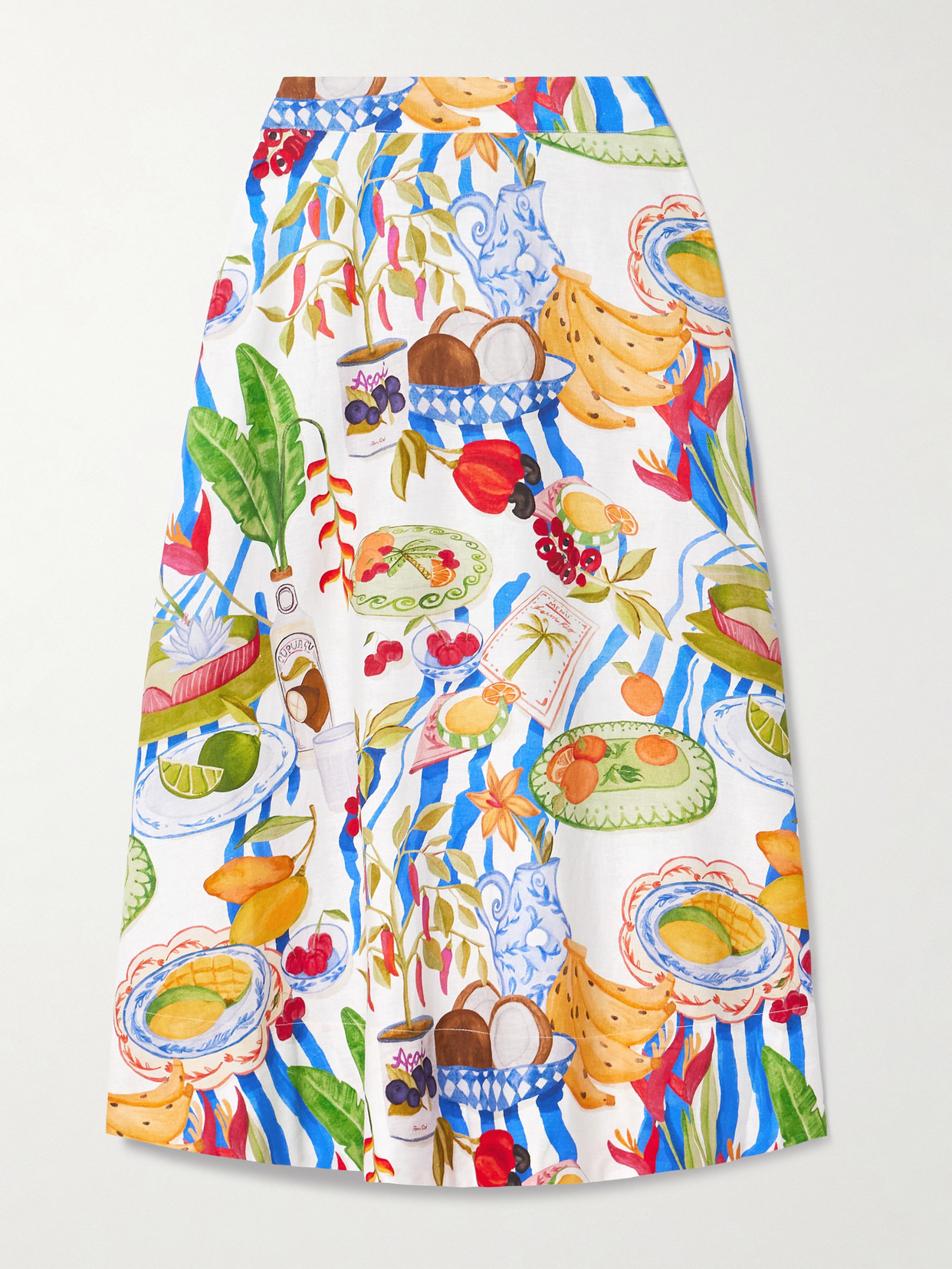 Farm Rio's skirt is printed with the label's 'Fresh Table' motif that features a vibrant array of food, flowers and striped linens. Part of a set with the matching top, it's made from airy linen-blend and has a partially elasticated wistband and discreet side pockets. Lower-Impact Materials. This product is made using at least 50% lower-impact materials or ingredients. Find out more about our NET SUSTAIN criteria here.