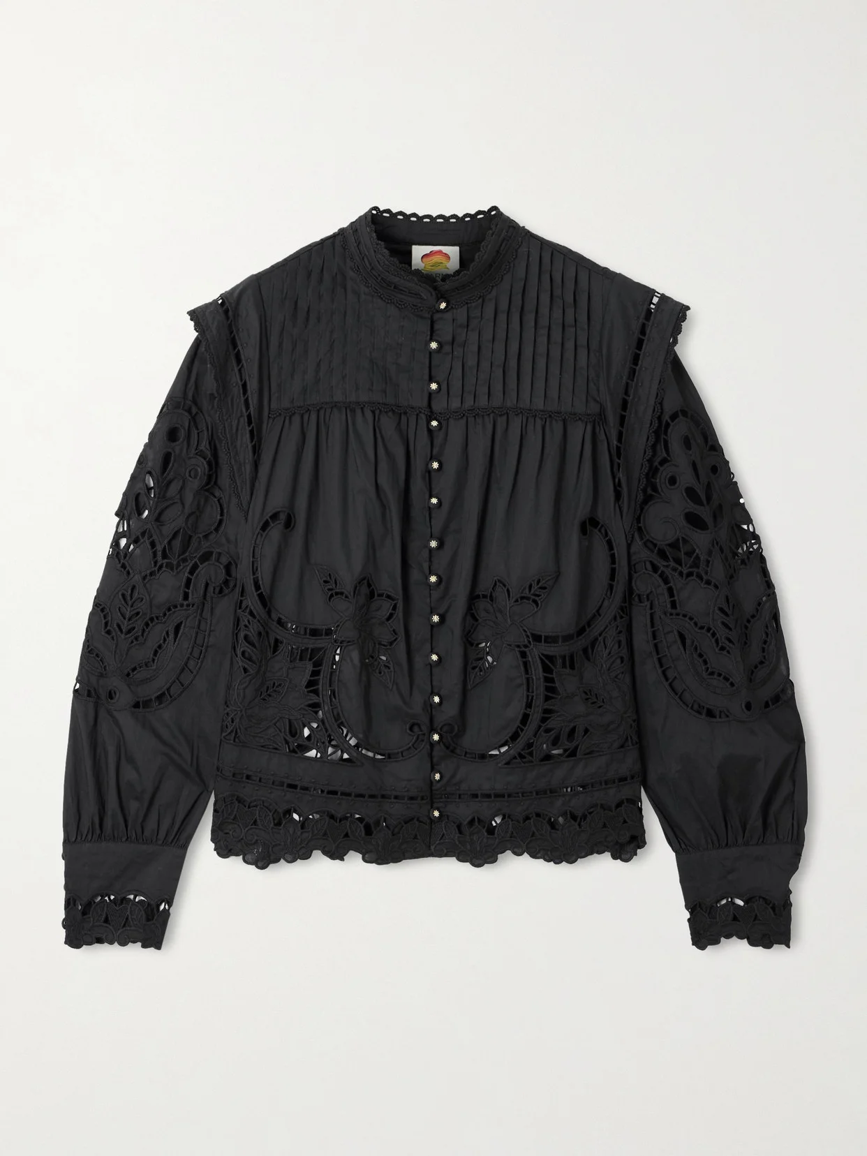 Farm Rio's 'Richilieu' blouse is perfect for balmy summer days. Cut from breathable broderie anglaise cotton depicting pretty blooms, it has a pleated high neckline and scalloped trims. Wear yours with jeans and ballet flats.