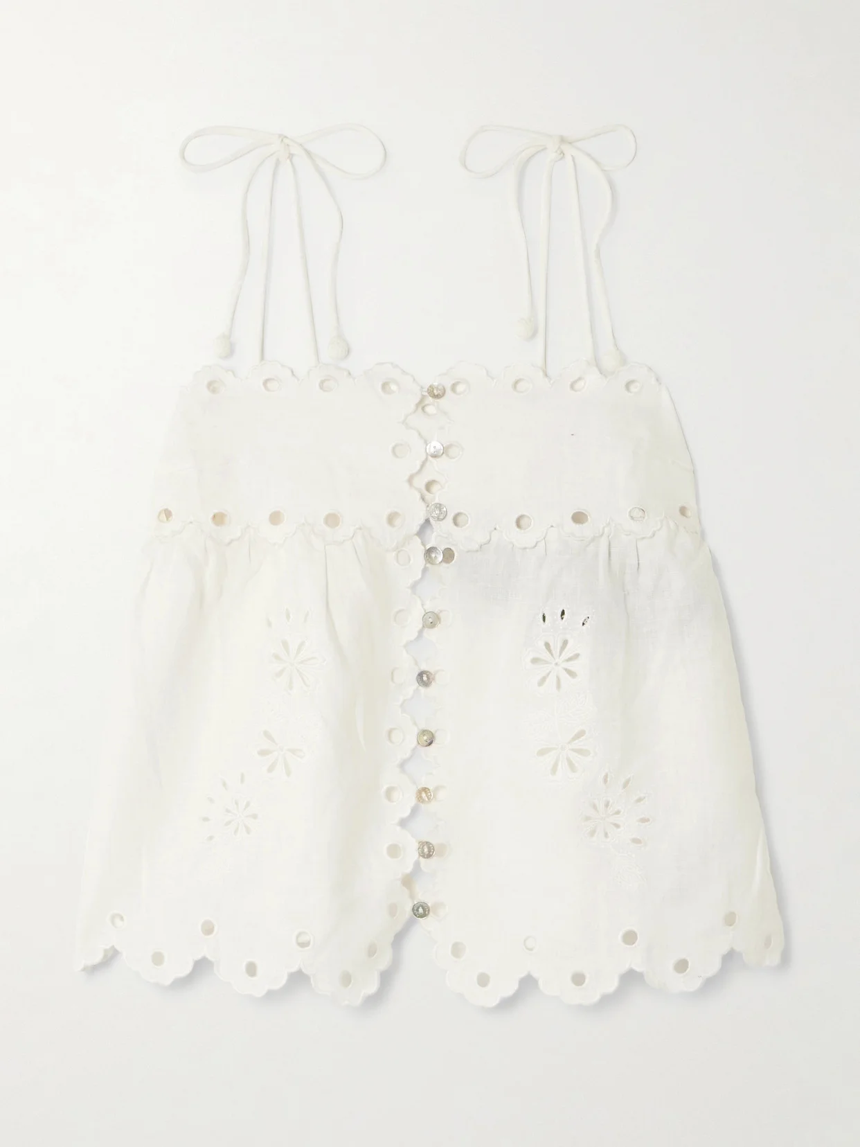 There's so much charm to Farm Rio's camisole, which will photograph beautifully in holiday snaps. It's paneled from broderie anglaise linen and has scalloped edges and straps tipped with woven pompoms. Team yours with the matching shorts and sandals. Lower-Impact Materials. This product is made using at least 50% lower-impact materials or ingredients. Find out more about our NET SUSTAIN criteria here.