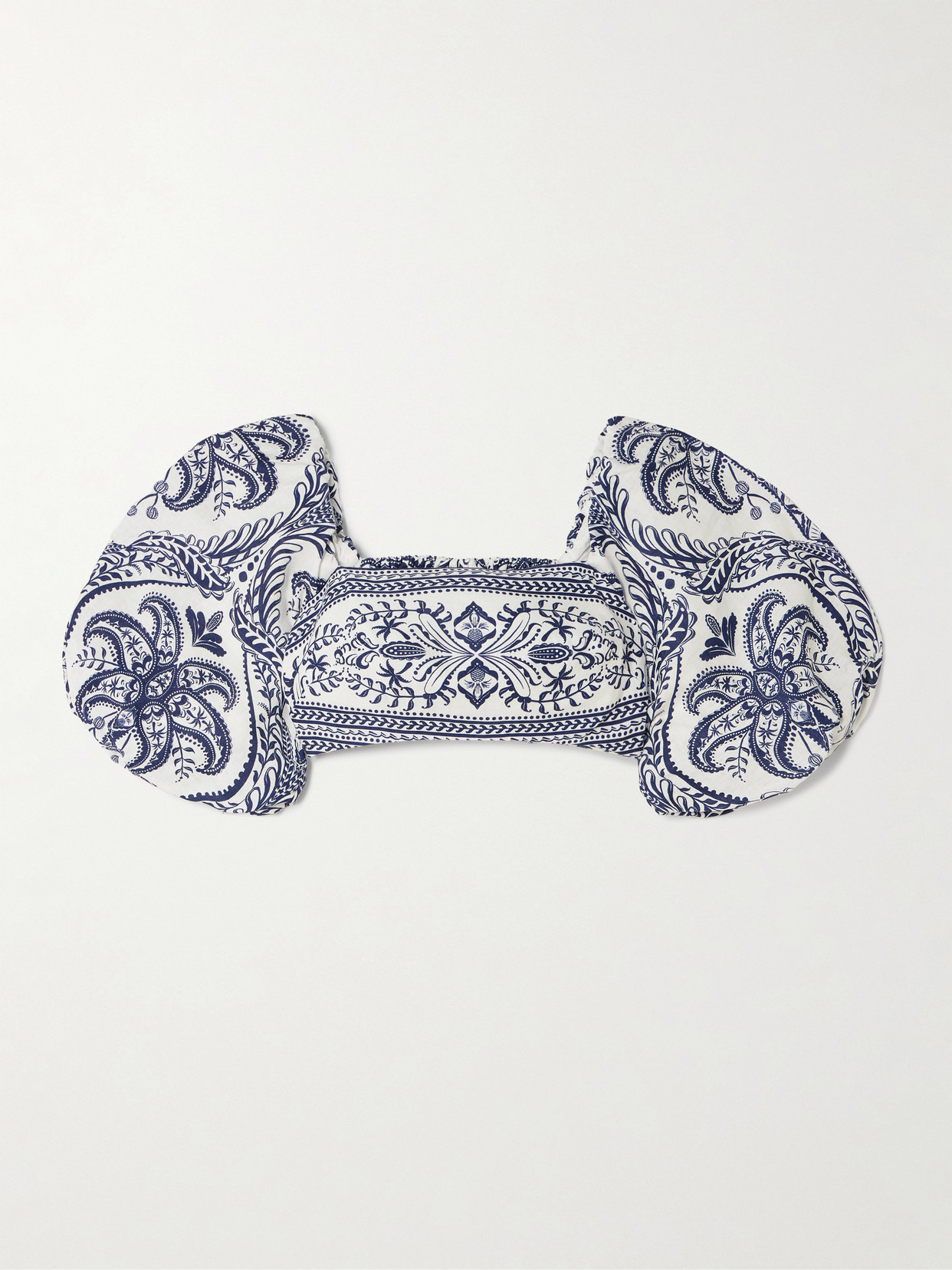 Farm Rio's cropped top is perfect for tropical getaways, especially when teamed with the coordinating skirt. It's made from lightweight linen and printed with paisley swirls shaped to resemble (and dotted inside with) palm trees. The square neckline is framed by puffy sleeves you can wear off-the-shoulder, while the shirred back ensures a close, comfortable fit. Lower-Impact Materials. This product is made using at least 50% lower-impact materials or ingredients. Find out more about our NET SUSTAIN criteria here.