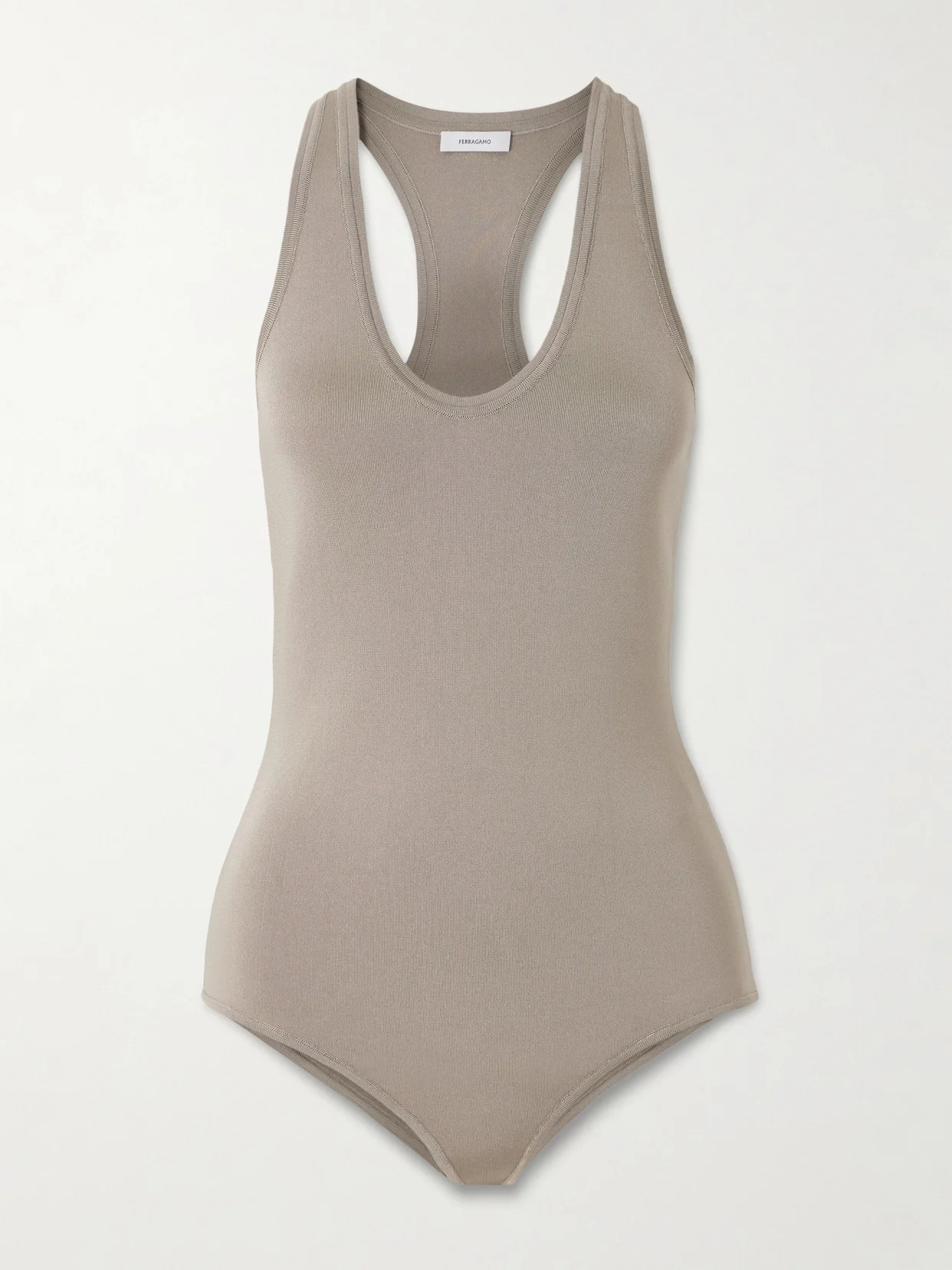 Ferragamo's Spring '25 line draws on the elegance and fluidity of ballet - the collection's moodboard features a picture of Salvatore fitting dancer and choreographer Katherine Dunham for shoes in 1950. This bodysuit is knitted for a close fit wit a touch of stretch and has a classic scooped neckline and racer-back. It'll go with so much in your wardrobe.