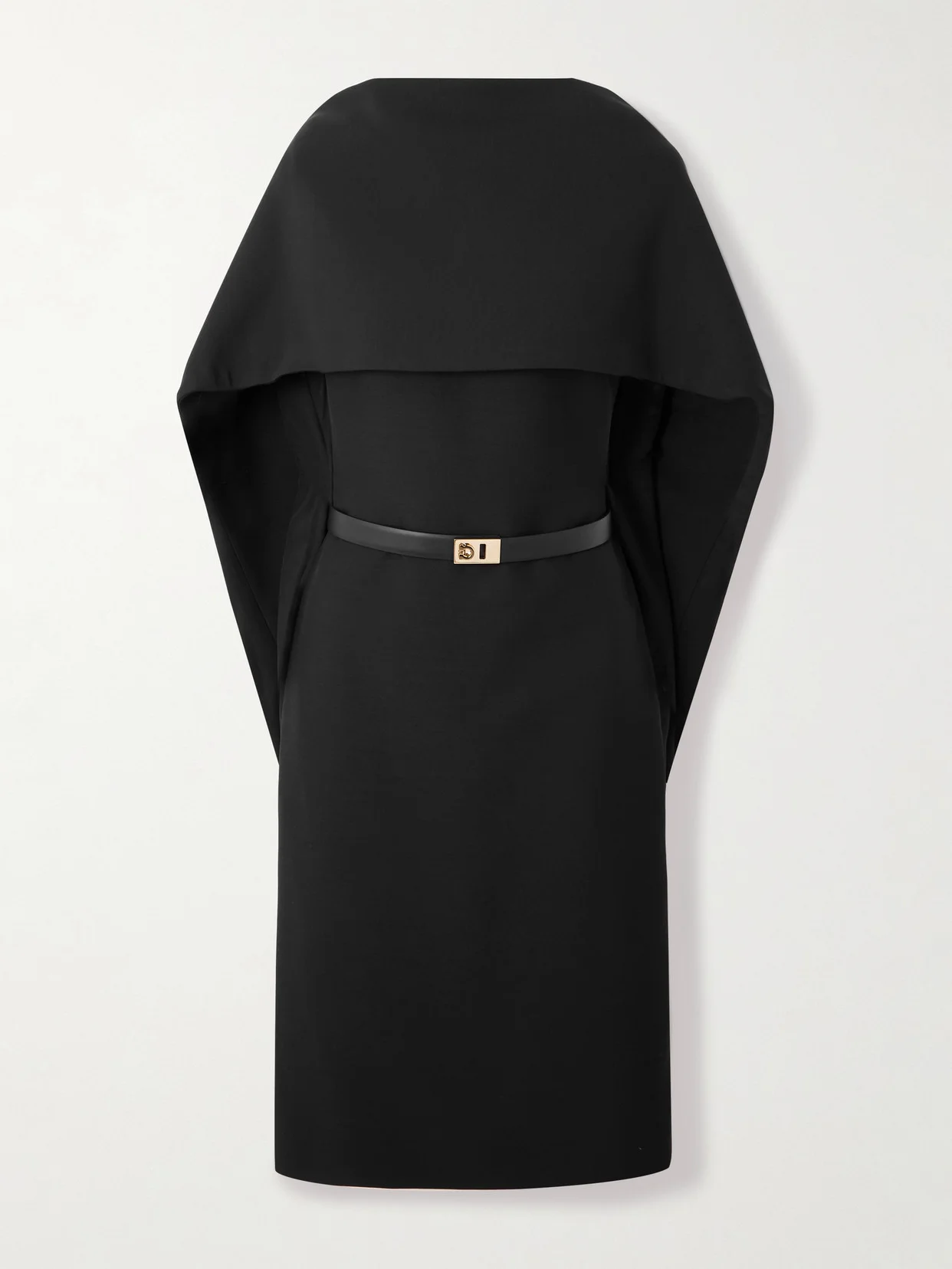 Under Maximilian Davis' creative direction, Ferragamo's Fall '25 runway "reinterprets movement through fluid silhouettes, tailored details and surrealist accents;" according to the brand. This dress is made from faille blended with a touch of wool and has a sweeping cape-effect panel that sits neatly over the column shape. Large to size. See Size & Fit notes.