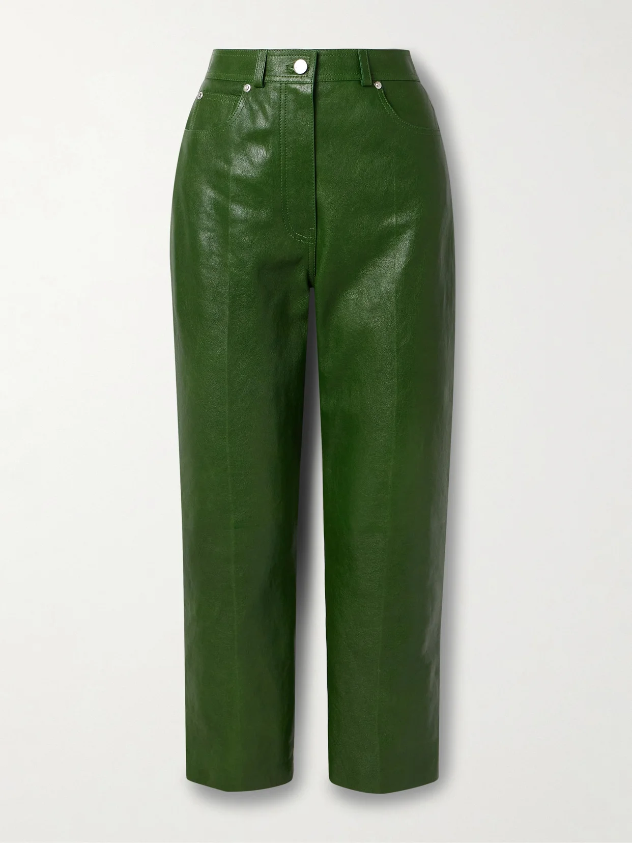 Ferragamo's pants debuted on the Spring '24 runway, where they were styled with the matching blazer in the same striking green color. Made from gently crinkled leather, they have a high-rise waist and straight legs with cropped hems. The full voile lining ensures they feel smooth against skin.