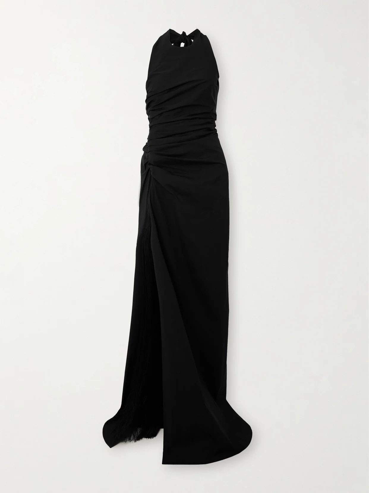 Fringed Gathered Stretch-cotton Poplin Halterneck Maxi Dress