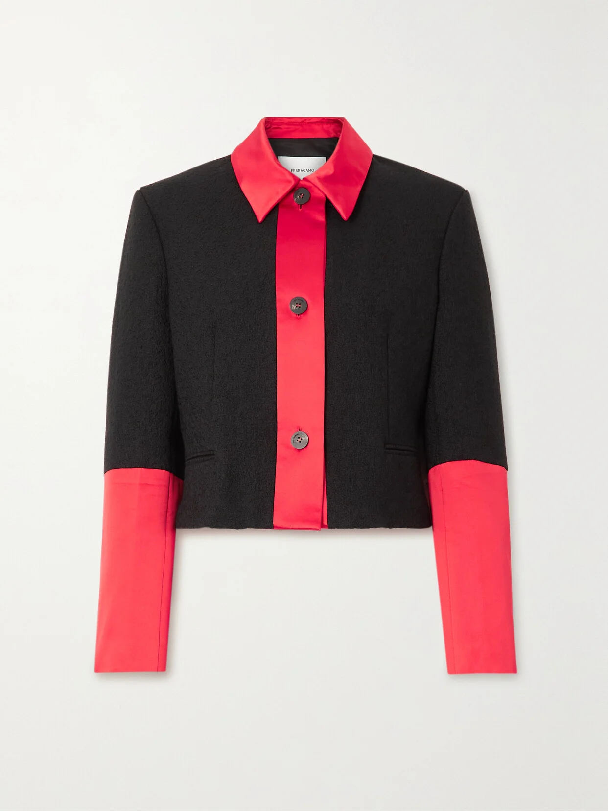 Ferragamo's jacket is made from tactile boucle contrasted by red silk trims - the one along the placket perfectly lines up with the coordinating mini skirt to form an elongating stripe. It's tailored for a slim fit with padded shoulders and a smart collar.