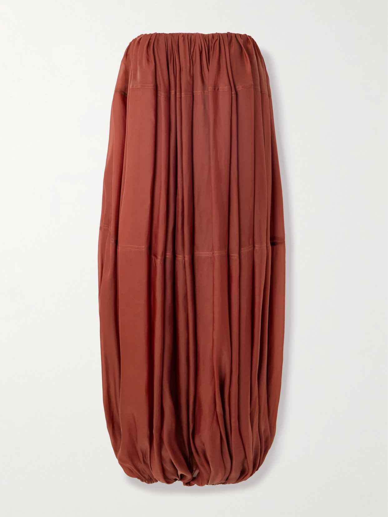Ferragamo's dress has a beautiful fluidity to it, inspired by the elegant movements of classical dancers. Cut from jersey blended with plenty of silk, it has a loose shape that's gathered at the strapless neckline and hem. The warm, earthy shade really stood out against the white backdrop of the Spring '25 runway.