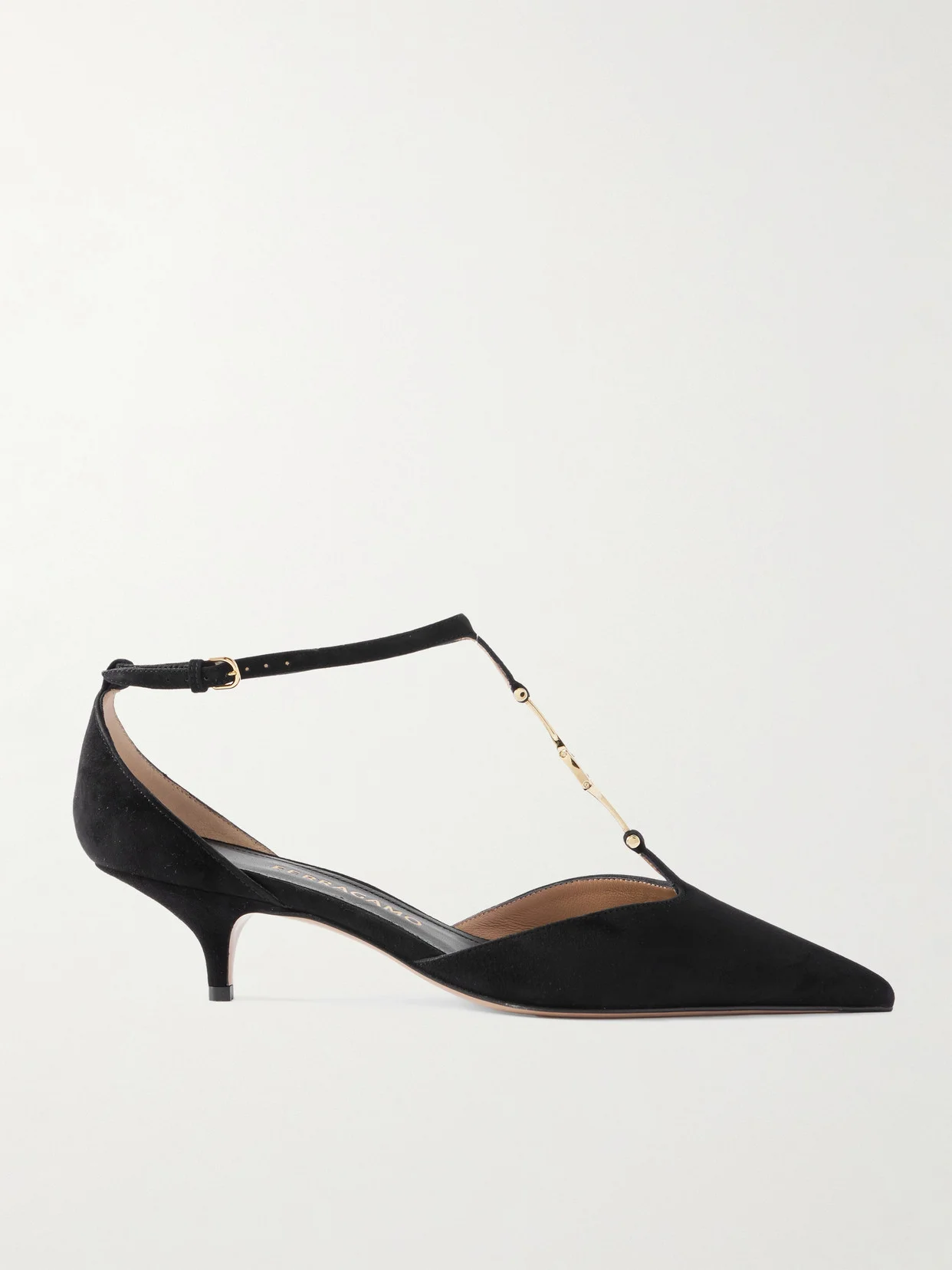 Ferragamo's 'Traci' pumps have classic T-bar straps adorned with gold-tone logo hardware. They've been crafted in Italy from suede and set on 40mm kitten heels. Show off the details with midi hemlines.