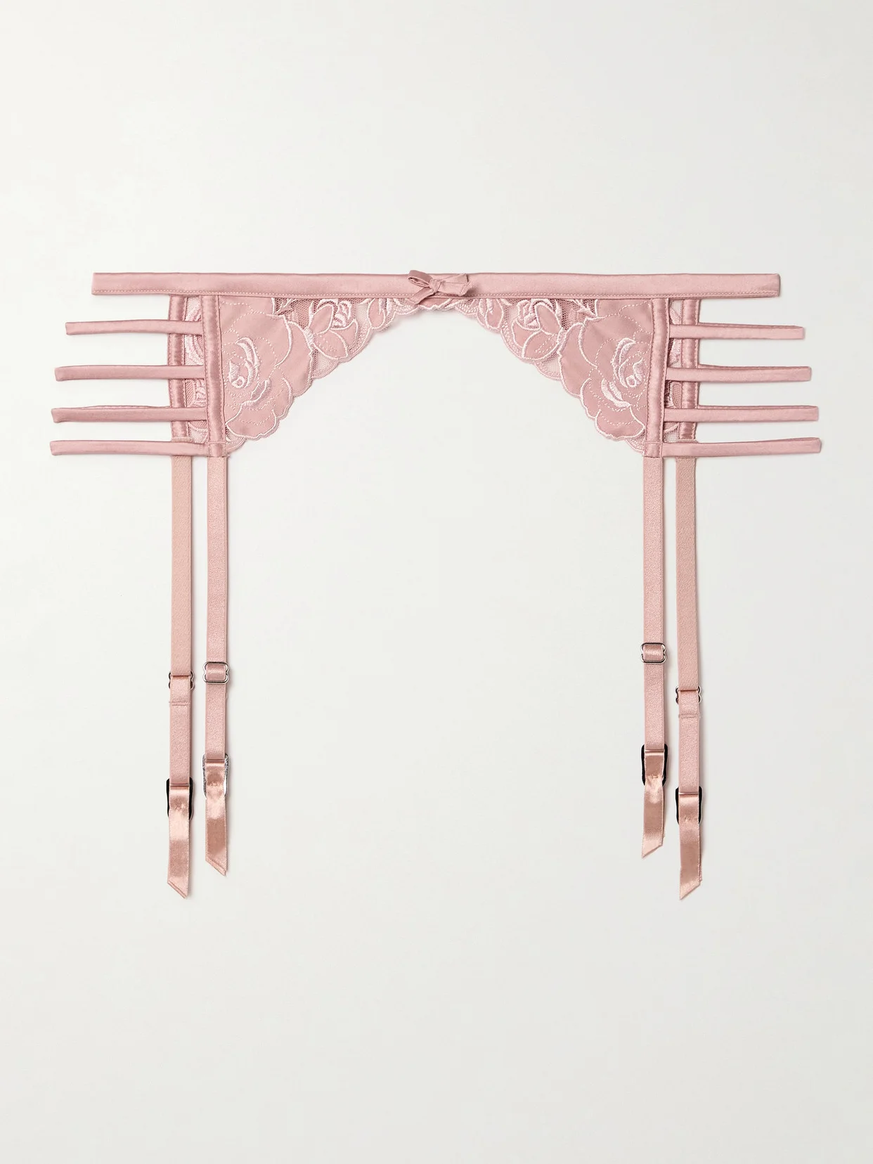 Fleur du Mal's 'Rose' suspender belt is part of a romantic set with the coordinating bra and briefs. It's made from panels of embroidered tulle and has silk-blend satin trims, the latter of which form caged cutouts at the sides.