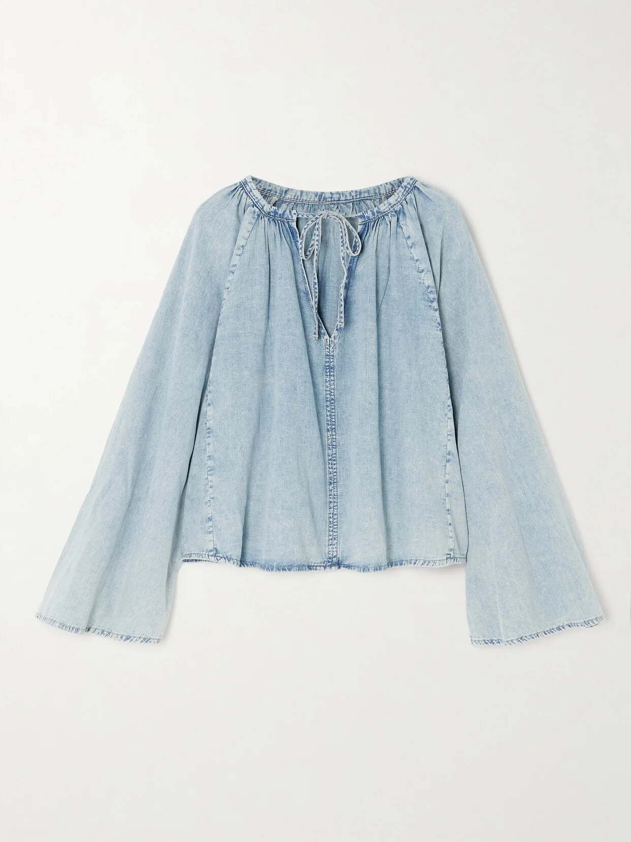 FRAME's voluminous blouse is effortless to style with midi skirts and denim alike. Cut from lightweight cotton and linen-blend chambray, it has wide sleeves and slender ties to secure the gathered V-neckline.