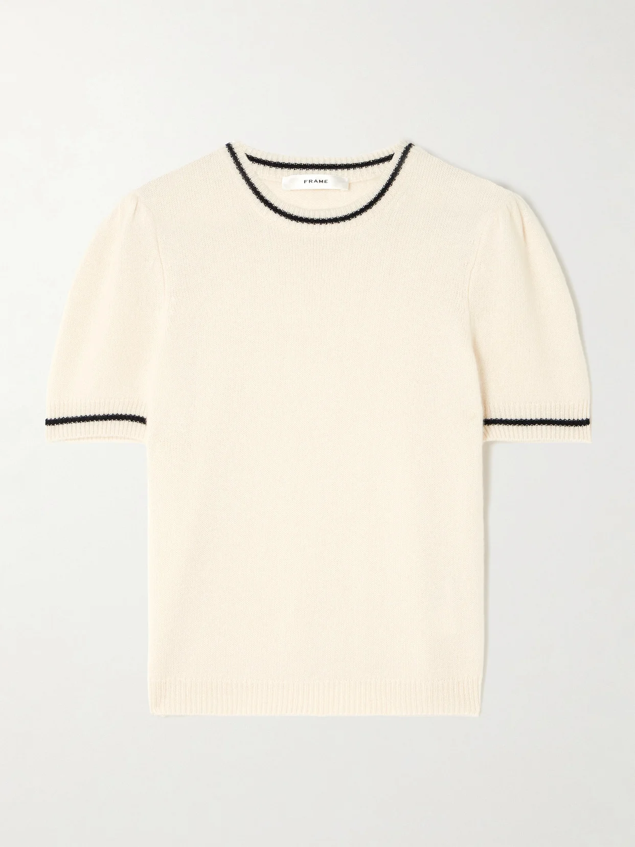 FRAME's 'Gathered' sweater has striped ribbed trims that define the slouchy shape and slightly puffed sleeves. It's made from sumptuous cashmere and will pair perfectly with a pair of the brand's jeans.