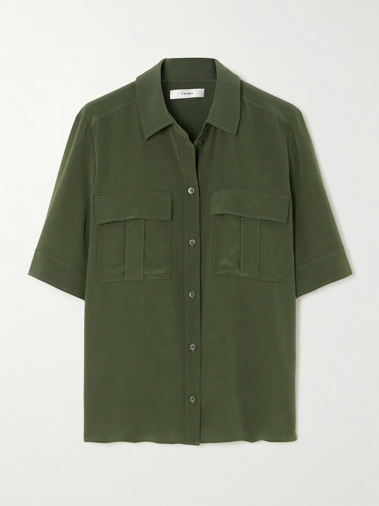 From the lush green hue to the utilitarian chest pockets, FRAME's shirt is reminiscent of military styles. It's made from silk-crepe and has a loose fit. Style yours with tailoring or jeans.
