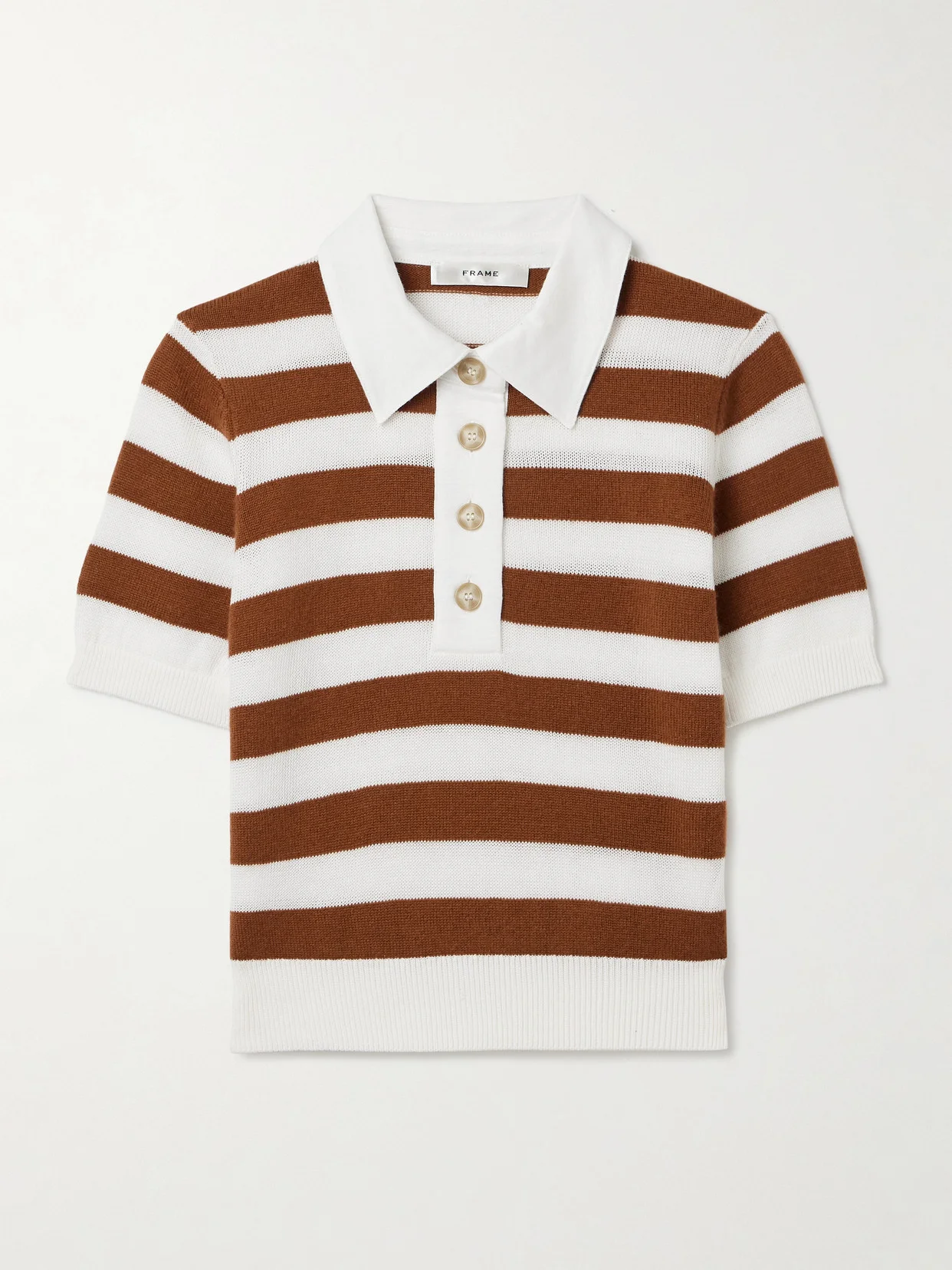 FRAME's shirt has a preppy, collegiate feel. It's made from sumptuous cashmere and cotton-blend that's patterned with brown and white stripes and is topped with a classic polo collar.