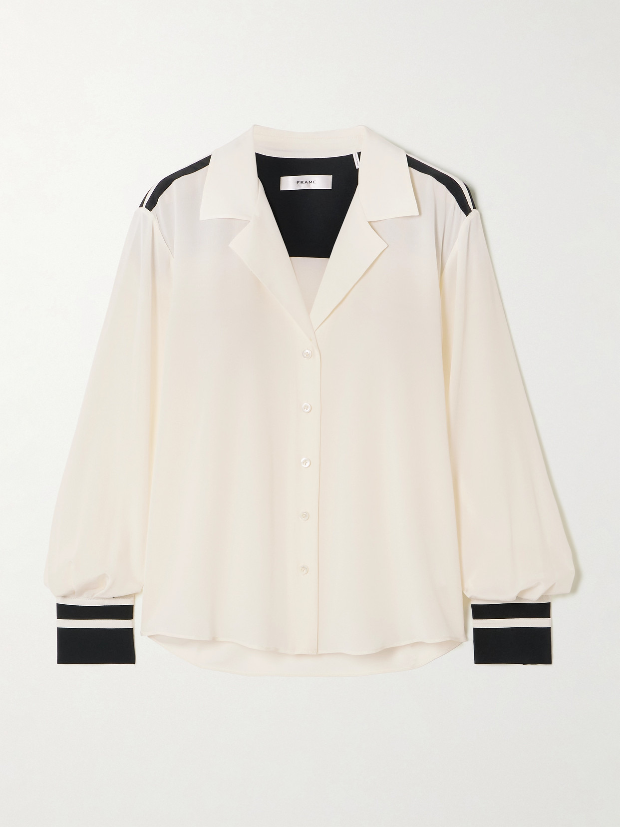 An elevated take on pajama dressing FRAME's shirt is tailored in a loose shape with a wide, notched collar. It's made from silk-crepe that drapes so well and is patterned with stripes across the back and cuffs. Pair yours with the coordinating pants.
