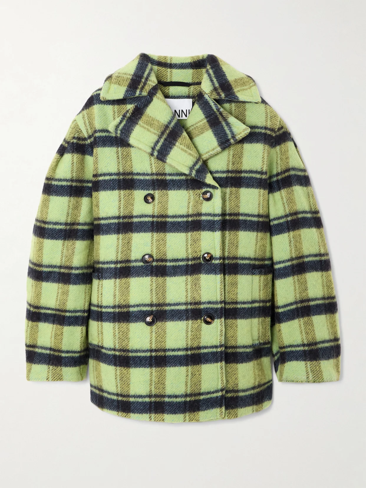 GANNI's Fall '25 collection is filled with eclectic, free-spirited designs. Made from brushed-wool, this coat is printed with colorful checks and has a double-breasted front and oversized fit. Continue the maximalist vibe with equally vibrant tailoring.