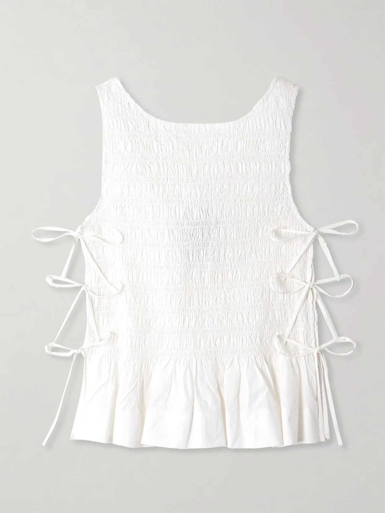 Tie-detailed Ruffled Shirred Organic Cotton-poplin Tank