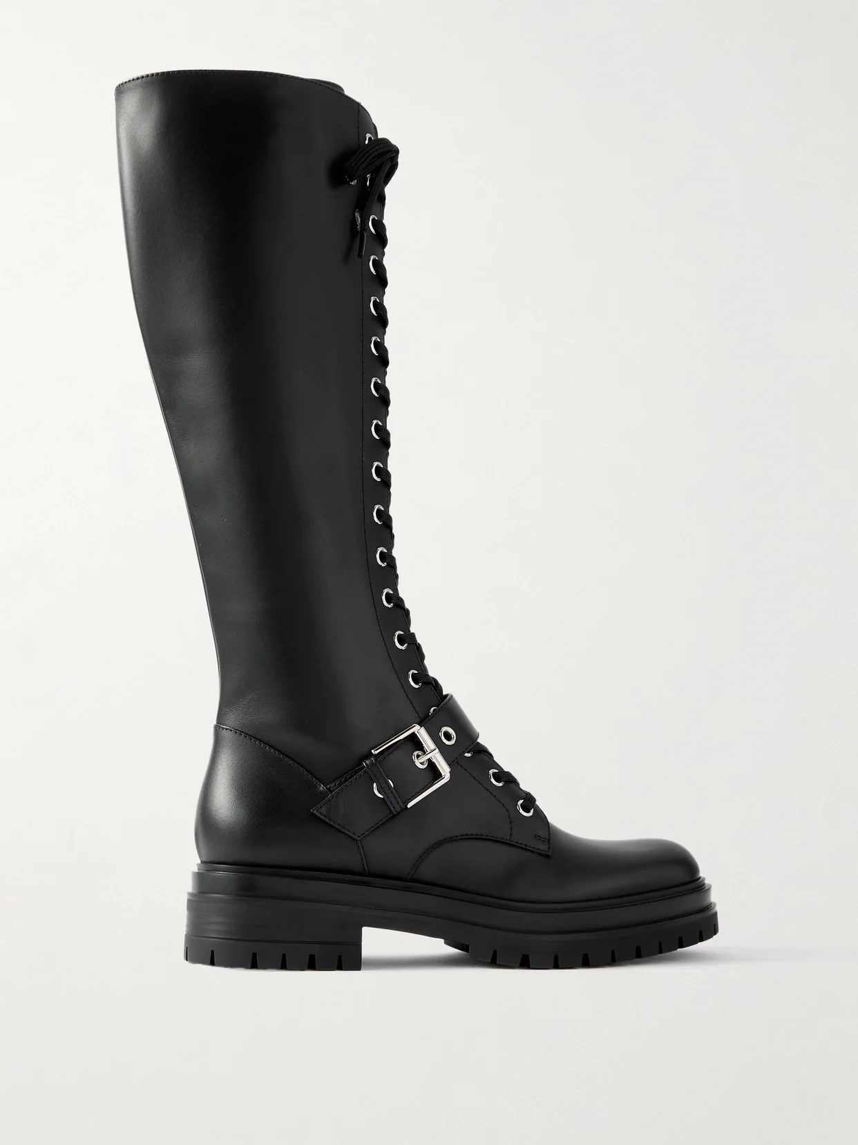 Striking a balance between refinement and rebellion, Gianvito Rossi's knee boots take cues from classic biker styles, reimagined with the brand's signature craftsmanship. They've been made in Italy from smooth leather and have punkish eyelets, lace-up fronts and an adjustable silver-tone buckle. The chunky rubber soles ensure traction.