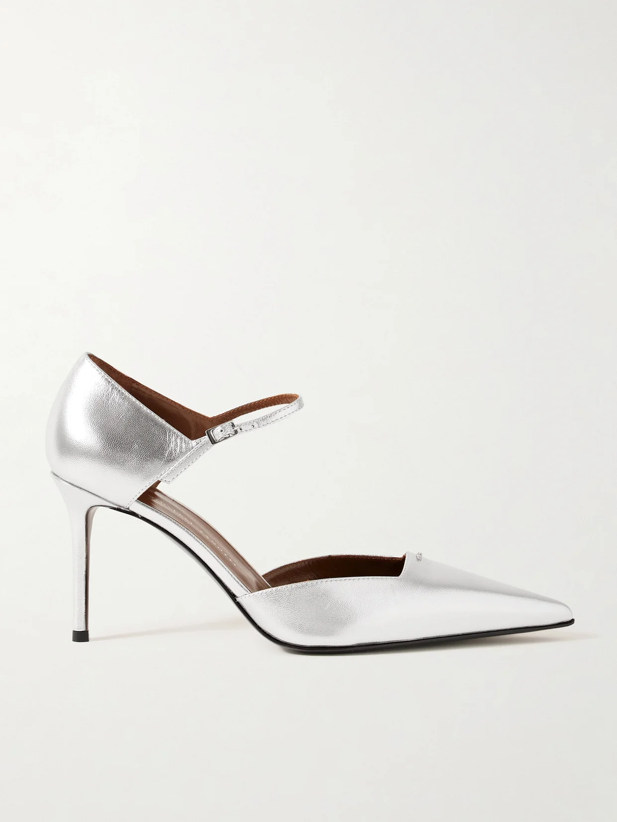 Giuseppe Zanotti's 'Mizuki' pumps will make anything you wear it with feel instantly glamorous, especially jeans. Made from silver leather, they have a row of tiny crystals just below the square vamps, cutout sides that show off the arch of your foot and a slim ankle strap. The heels offer 85mm of lift.