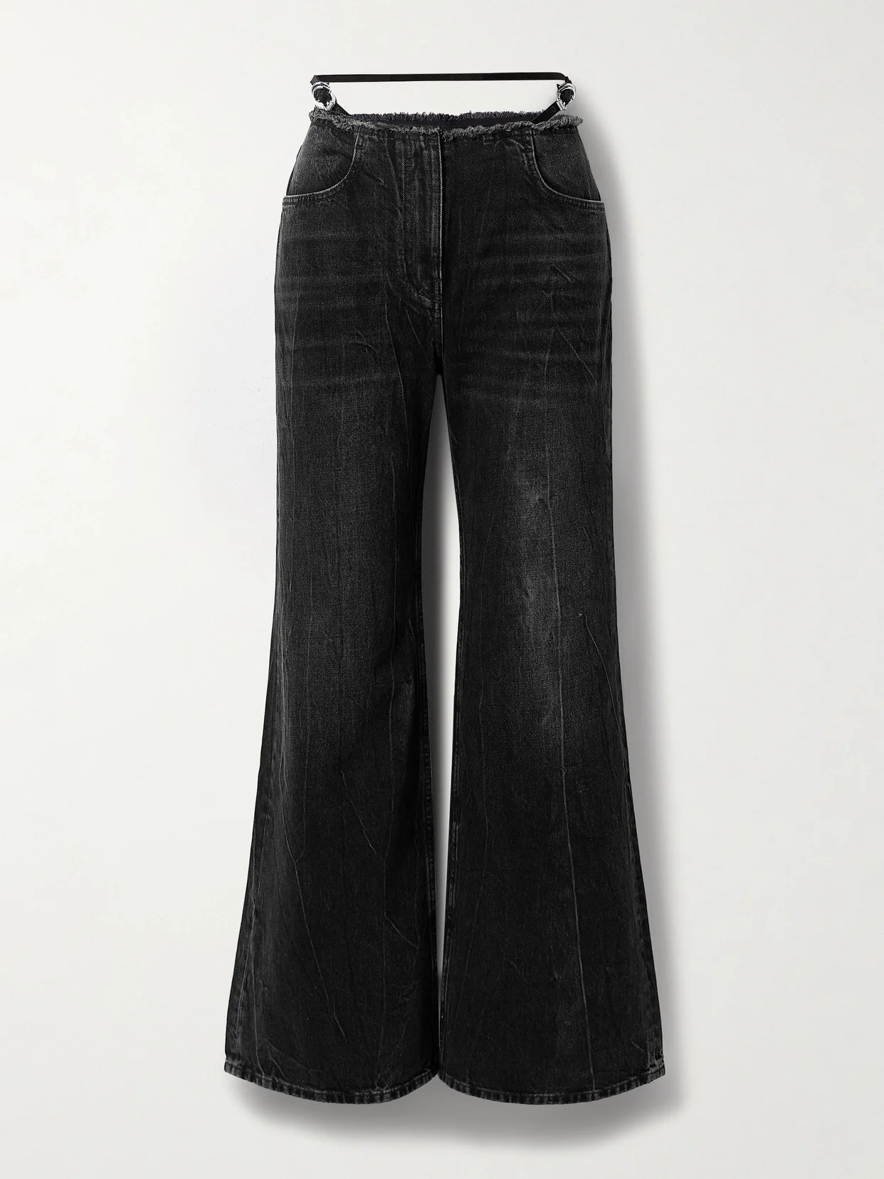 In place of a traditional waistband, Givenchy's low-rise jeans have frayed edges and adjustable buckled straps that hug your hips. They're cut from washed black denim and have baggy, wide legs. Style yours with a tucked-in or cropped top to showcase the details.