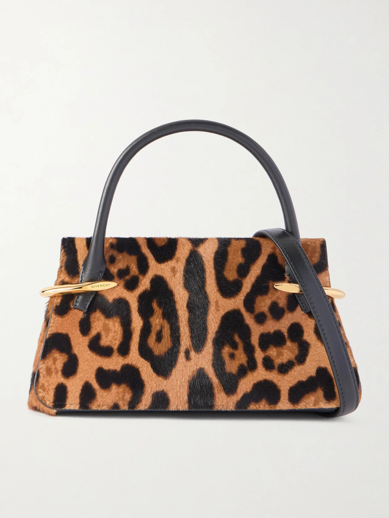 Givenchy's 'Pinch' shoulder bag has a trapeze shape squeezed by gold-tone hardware, hence the name. It's been made in Italy from leopard-print calf hair and holds just enough space inside for your phone, cards and a lip gloss. Attach the leather shoulder strap to keep your hands free.