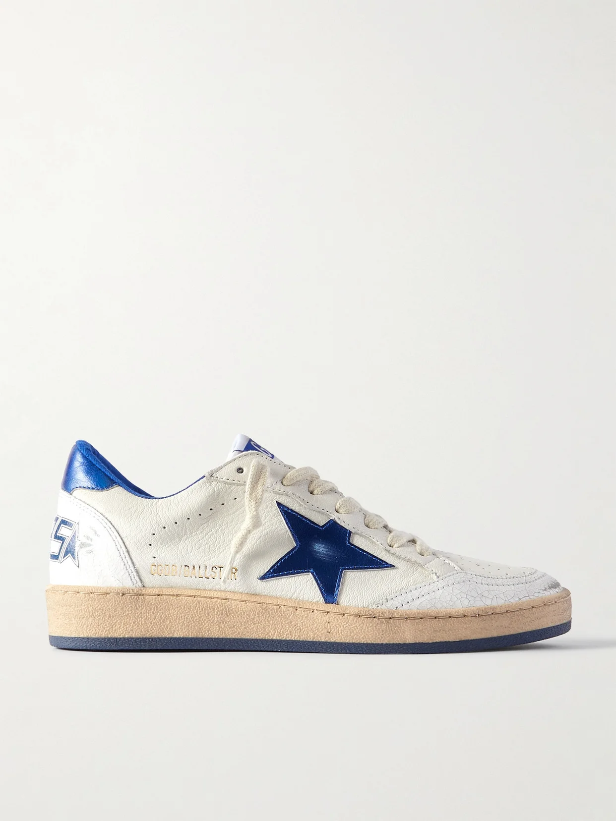 Crafted in Golden Goose's Italian atelier, these 'Ball Star' sneakers emphasize the brand's best-loved signatures. They're made from supple, hand-distressed off-white leather trimmed with the signature star motif in electric-blue and have comfortable rubber soles. Note the graffiti-inspired 'SNEAKERS' stamp and canvas heel tabs.