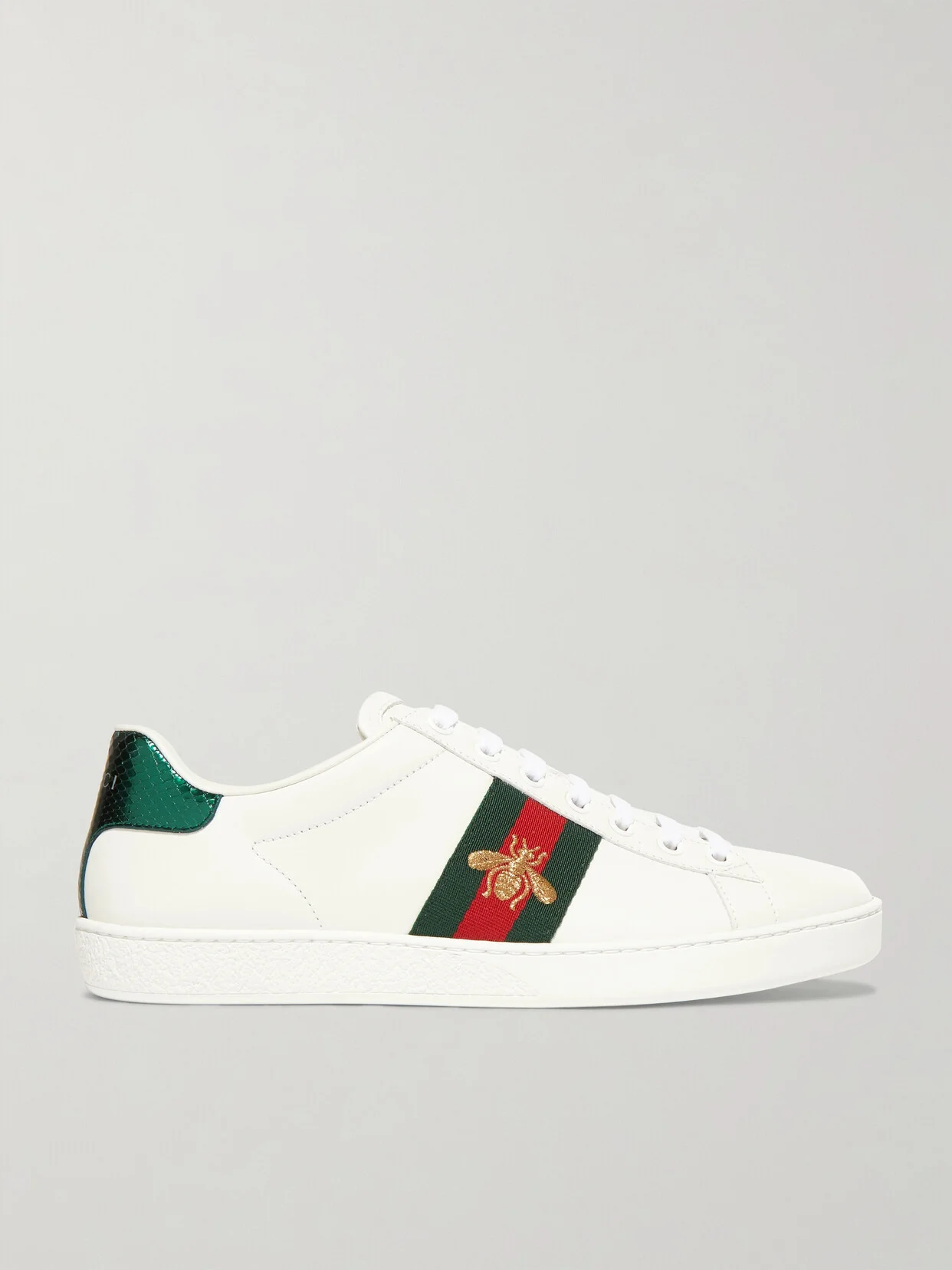 First launched for Pre-Fall '16, Gucci's 'Ace' sneakers have earned a cult following with Alessandra Ambrosio and Chiara Ferragni both fans. Reworked for the new season, this white leather pair is paneled with heritage webbed stripes and mismatched metallic watersnake at the heel. We particularly like the embroidered gold bumble bees - one of the many animal motifs Alessandro Michele has introduced during his reign.