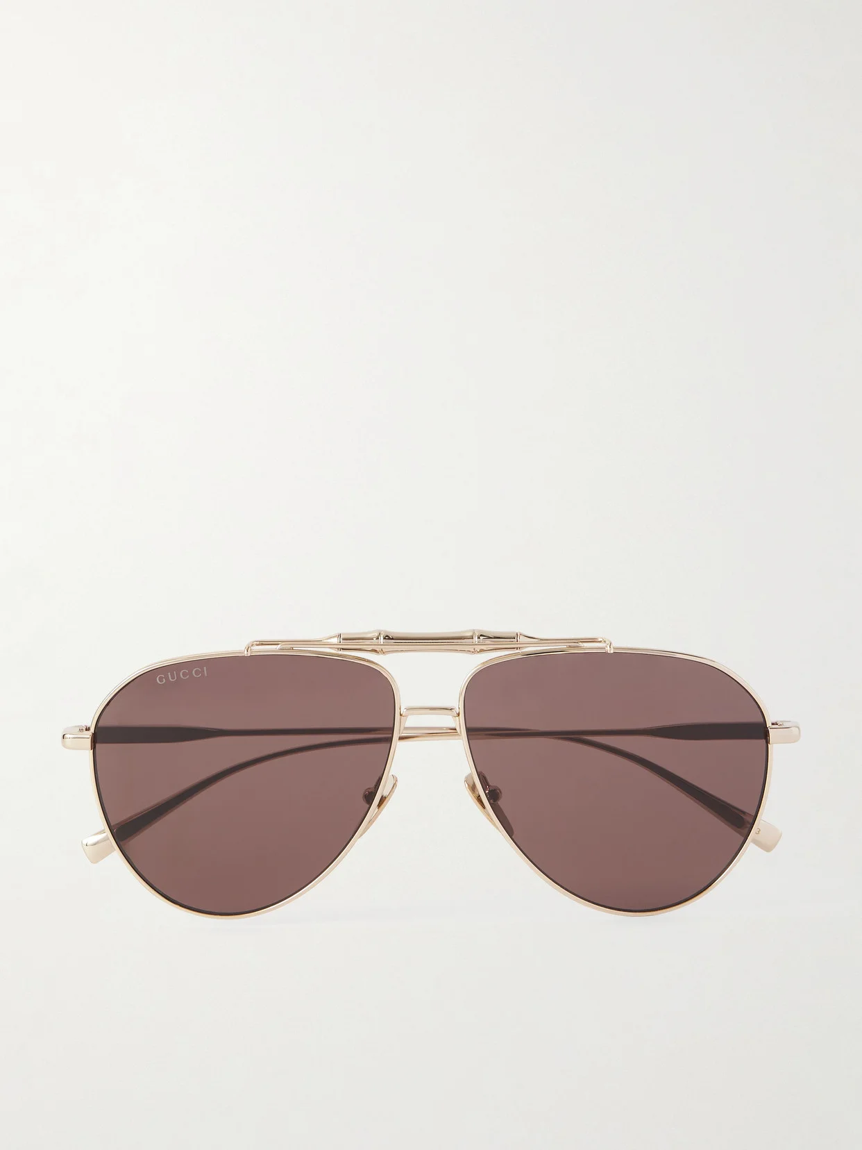 Gucci Eyewear's sunglasses are adorned with a bamboo-inspired double bridge that nods to the handles of its iconic bags. They're made from gold-tone metal with aviator-style frames and brown lenses.