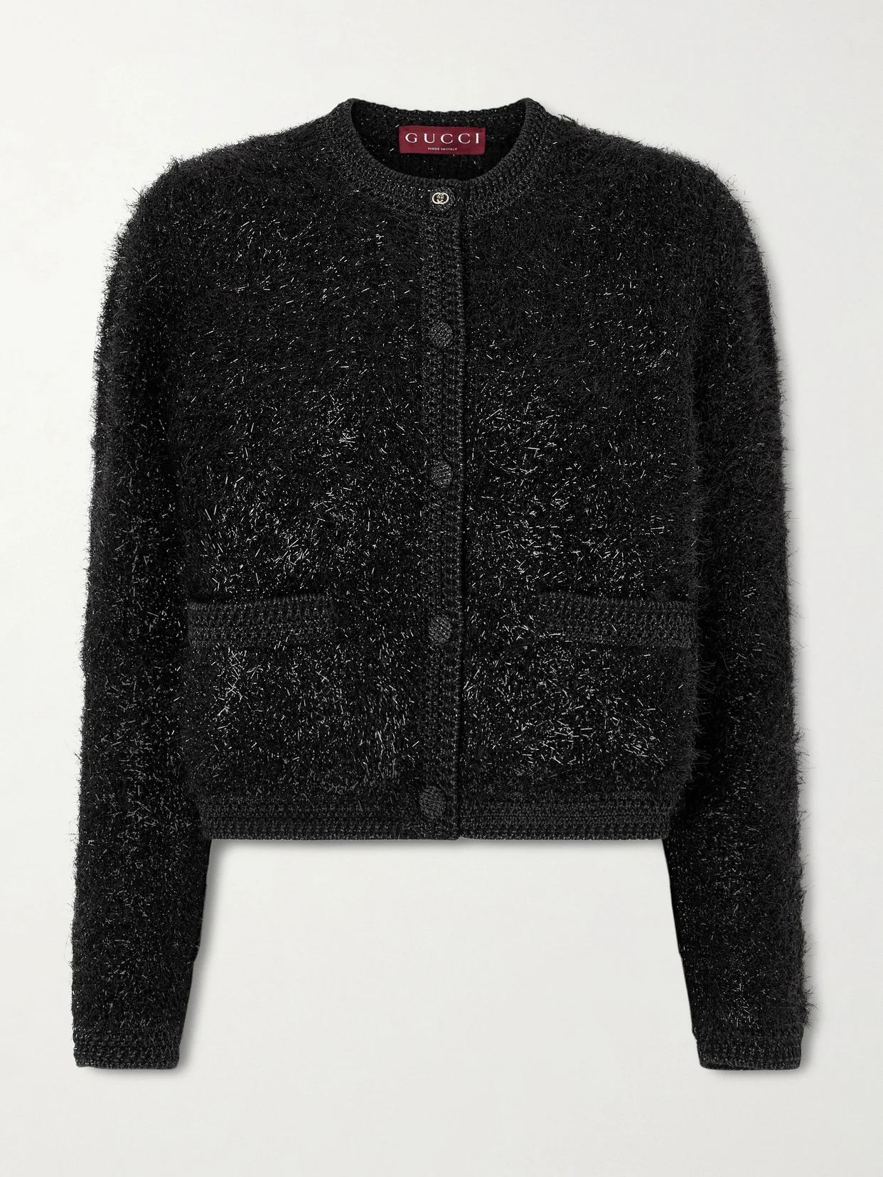 Gucci's cardigan is knitted from brushed metallic yarn for a shimmering tinsel effect. Perfect for the next dinner booking or festive party, it has a chunky handle and is finessed with the iconic 'GG' hardware.