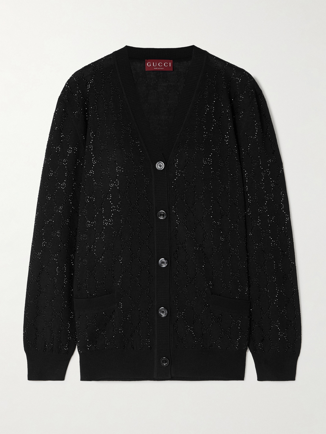 Gucci's cardigan is a study in quietly expressive elegance. It's been knitted in Italy from soft wool yarns for a relaxed profile with comfortable dropped shoulders and is mapped with the house's 'GG' motif in glinting crystal embellishments. Follow the care instructions to ensure it remains just as beautiful long after the first wear.