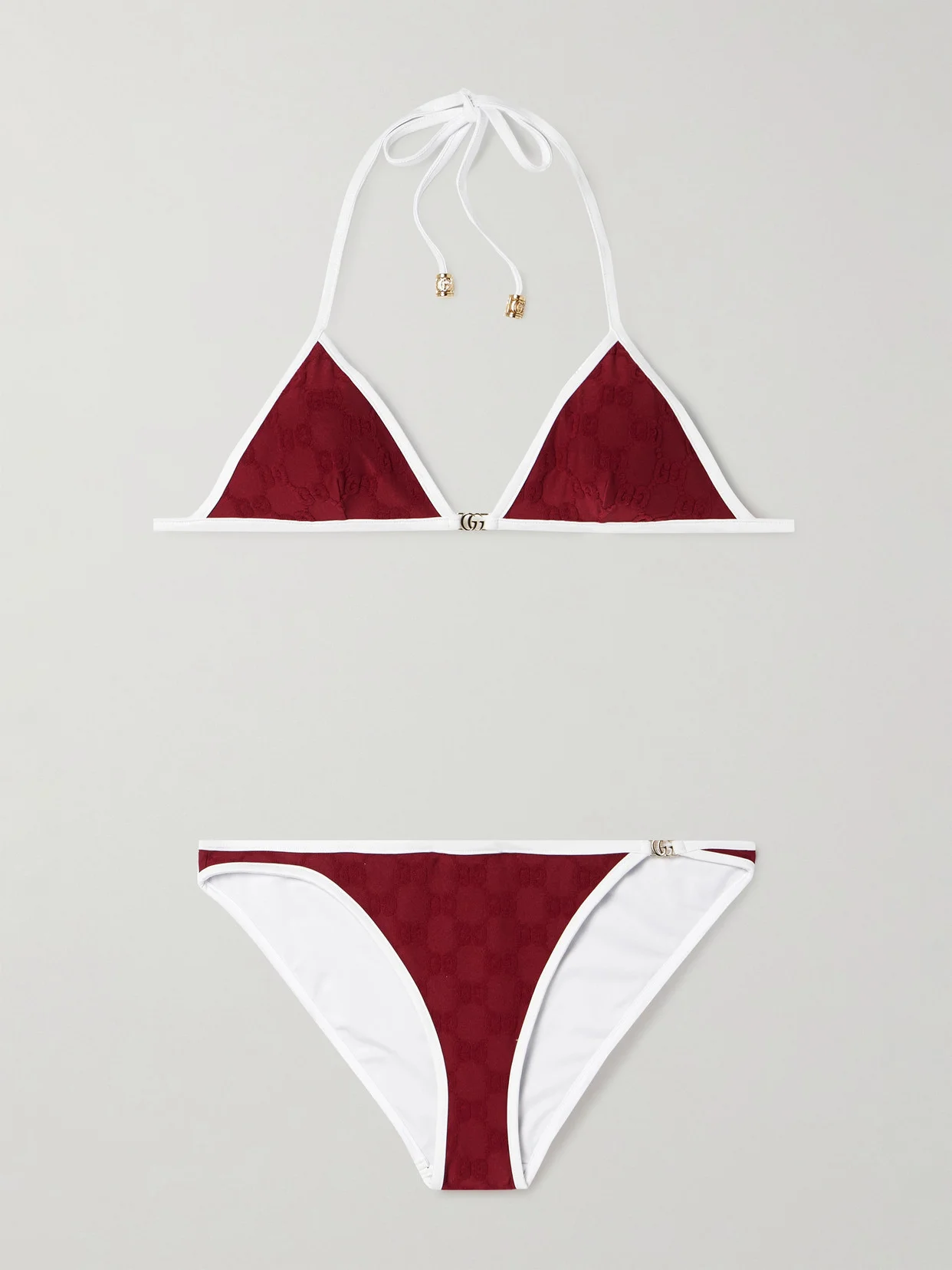 Gucci's bikini is flocked with the iconic interlocking 'GG' monogram in soft terry - you can see the same motifs in gold-tone hardware adorning the triangle cups and low-rise briefs. It's been made in Italy from stretch fabric and has white trims that add to its retro feel. Small to size. See Size & Fit notes.