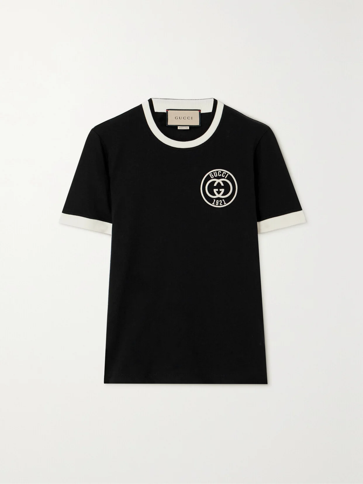 In the hands of Gucci, the humble T-shirt has never looked better. Modeled on retro sportswear, it's made from soft cotton-jersey detailed with the iconic Italian label's interlocking 'G Gucci 1921' embroidery in the same white threads as the ribbed trims.